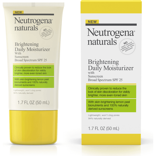 Achieve visibly brighter, more even-toned skin with the NEUTROGENA. ®. Naturals Brightening Daily Moisturizer with Mineral Sunscreen Broad Spectrum SPF 25. This brightening face moisturizer with SPF 25 helps protect skin from sun damage and is clinically proven to reduce the look of skin discoloration. Its lightweight, fast-absorbing formula contains 100% naturally-derived mineral sunscreens—titanium dioxide and zinc oxide—and skin-brightening lemon peel, an effective bionutrient that works with your skin to noticeably even skin tone in just 4 weeks. This daily facial moisturizer is made with 94% naturally-derived ingredients and contains no harsh chemical sulfates, parabens, petrolatum, dyes, or phthalates. From the Neutrogena Naturals line of ecologically sensitive skincare products, this sunscreen moisturizer is also non-comedogenic so it won't clog pores.