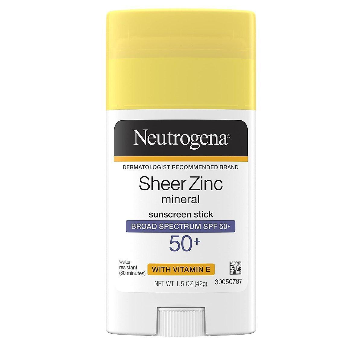Neutrogena Sheer Zinc Oxide Mineral Sunscreen Stick With Vitamin E, Broad Spectrum SPF 50+ & UVA/UVB Protection, Water Resistant & Residue-Free Application, Paraben/Dye Free, 1.5 Oz