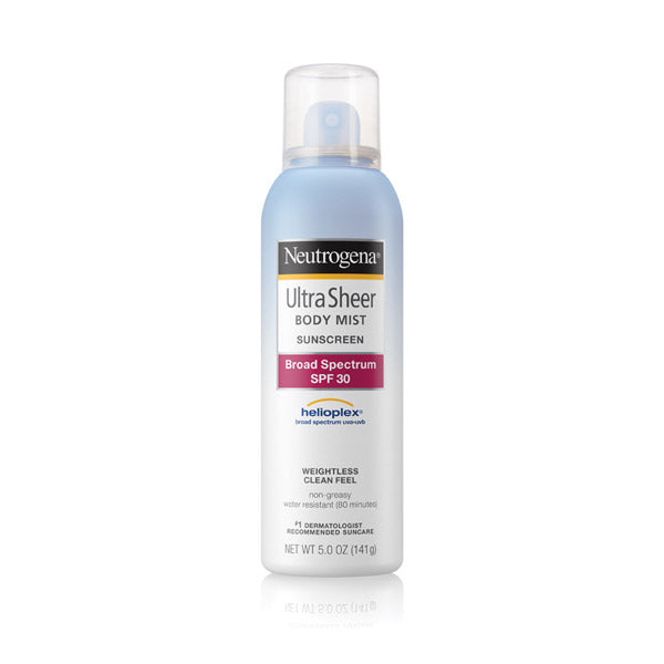 Help protect your skin with Neutrogena Ultra Sheer Body Mist Sunscreen with Broad Spectrum SPF 30. This weightless, sheer mist applies easily, even to hard-to-reach areas, and its one-touch continuous spray works at any angle. This mist is formulated with clinically-proven Helioplex, an advanced sunscreen technology with superior broad-spectrum protection from skin-aging UVA rays and skin-burning UVB rays. This sunscreen is water-resistant up to 80 minutes. It is from a dermatologist recommended brand, oil-free, non-comedogenic, and PABA-free.
