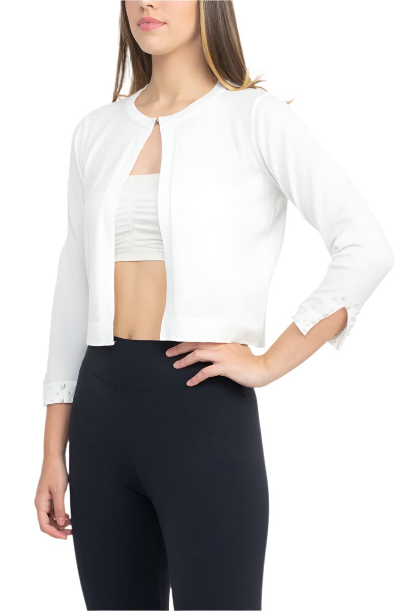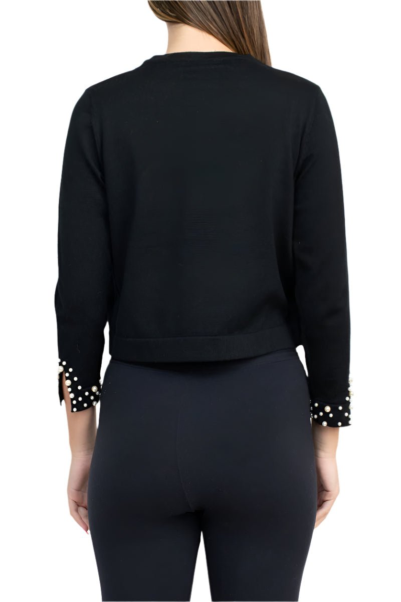 Crafted from a soft, structured knit (80% Rayon, 20% Polyester), this cropped bolero features a clean crew neckline and a discreet hook closure at the front for a tailored look. The standout detail? Elegant 3/4 sleeves finished with subtly embellished cuffs—adding just the right amount of sparkle to elevate your ensemble without overwhelming it. Lightweight and easy to layer, this wardrobe essential transitions seamlessly from day to evening.