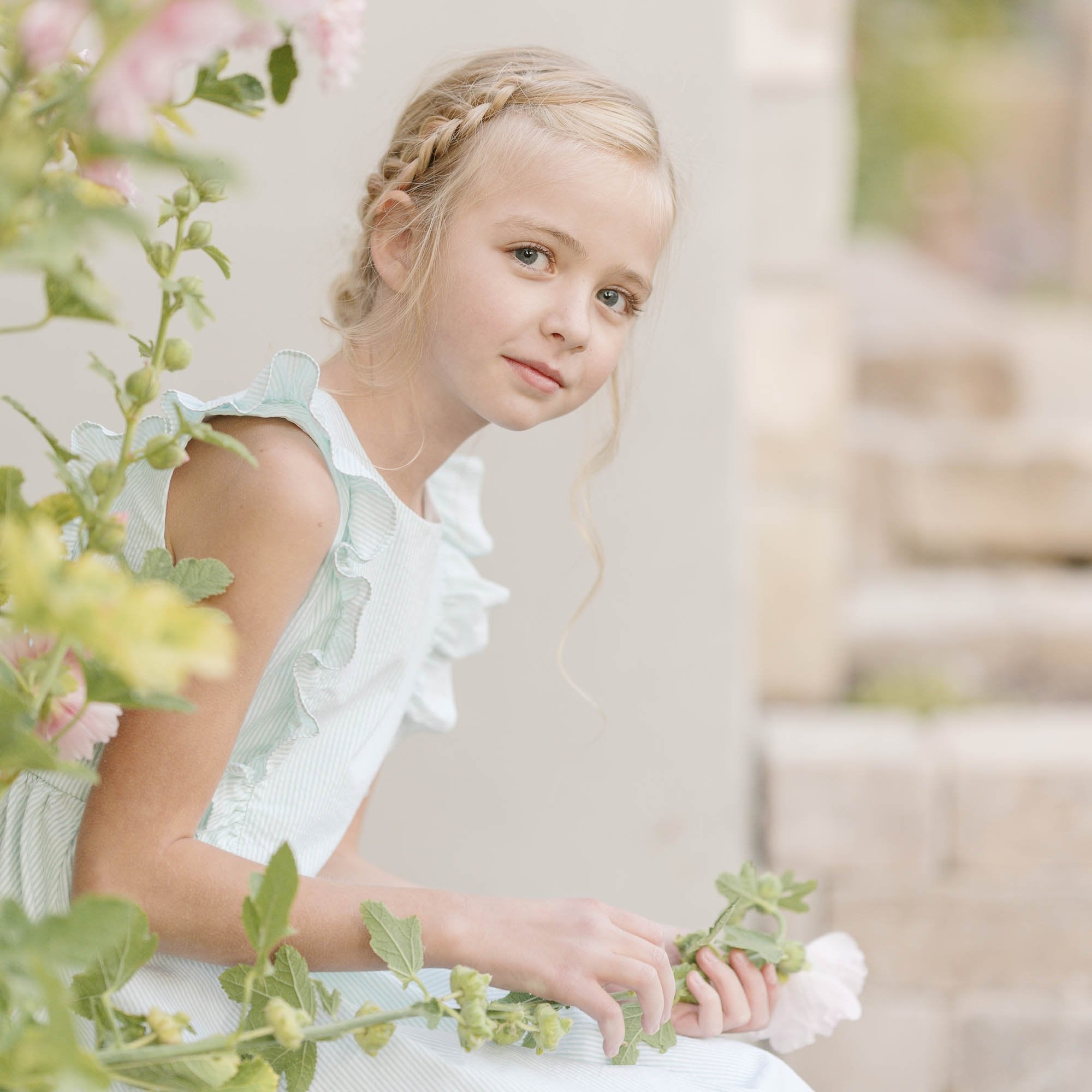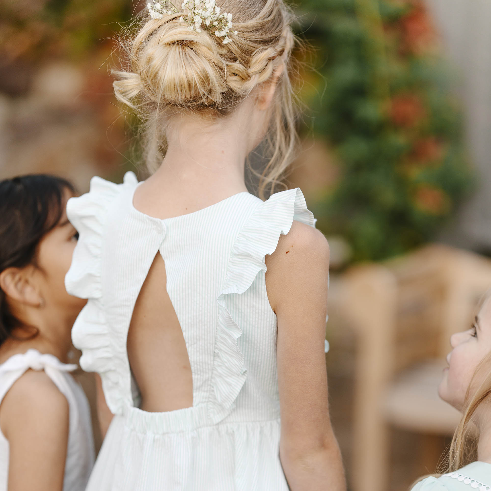 Our pretty flutter sleeve dress in soft organic cotton seersucker is a statement piece she'll want to twirl in all spring and summer long. Features flutter sleeves along a pinafore bodice, a pretty open back with button closure at the neck, and an elastic waist for easy dressing. Lined at the bodice in 100% organic cotton.