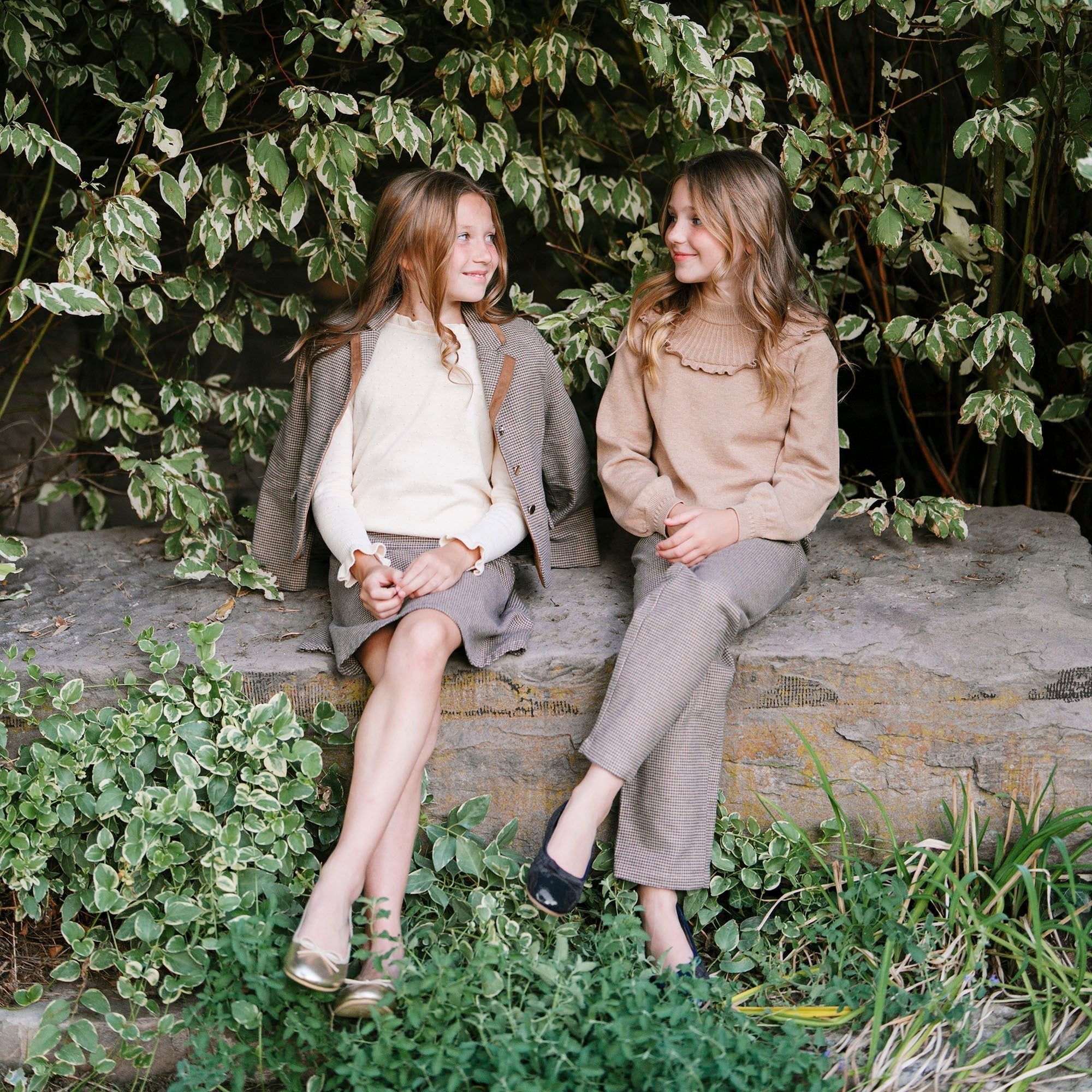 Our refined long sleeve mock neck sweater crafted from soft organic cotton elevates your girl's style for the fall and winter season. Features a mock neck with gold button closure, a ruffle detail at the yoke, and a beautiful textured knit to frame her face. Pairs perfectly with our assortment of organic cotton skirts, jumpers, and leggings.