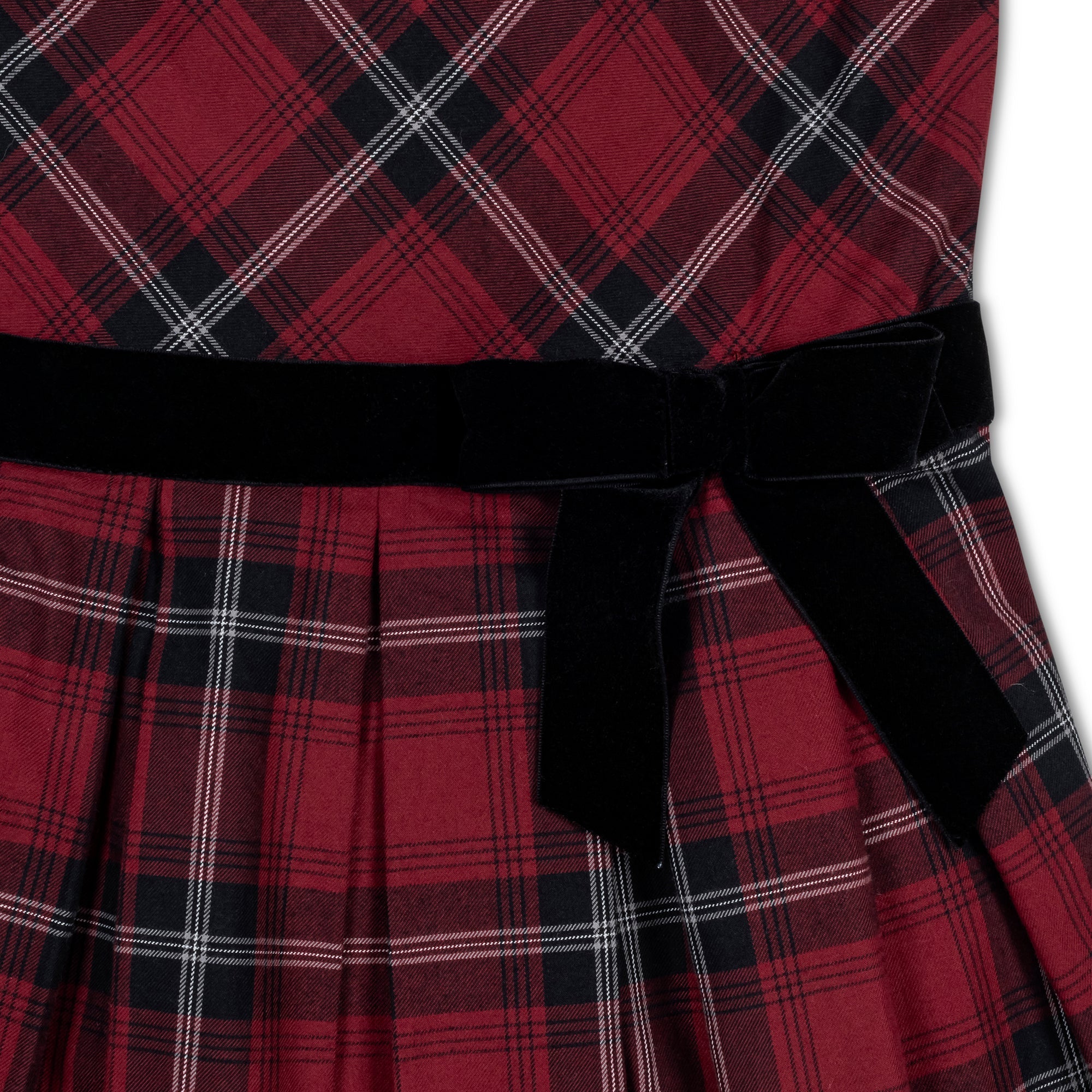 • Woven collar. Zipper at center back. Velvet waist sash and bow. Fully lined in cotton.