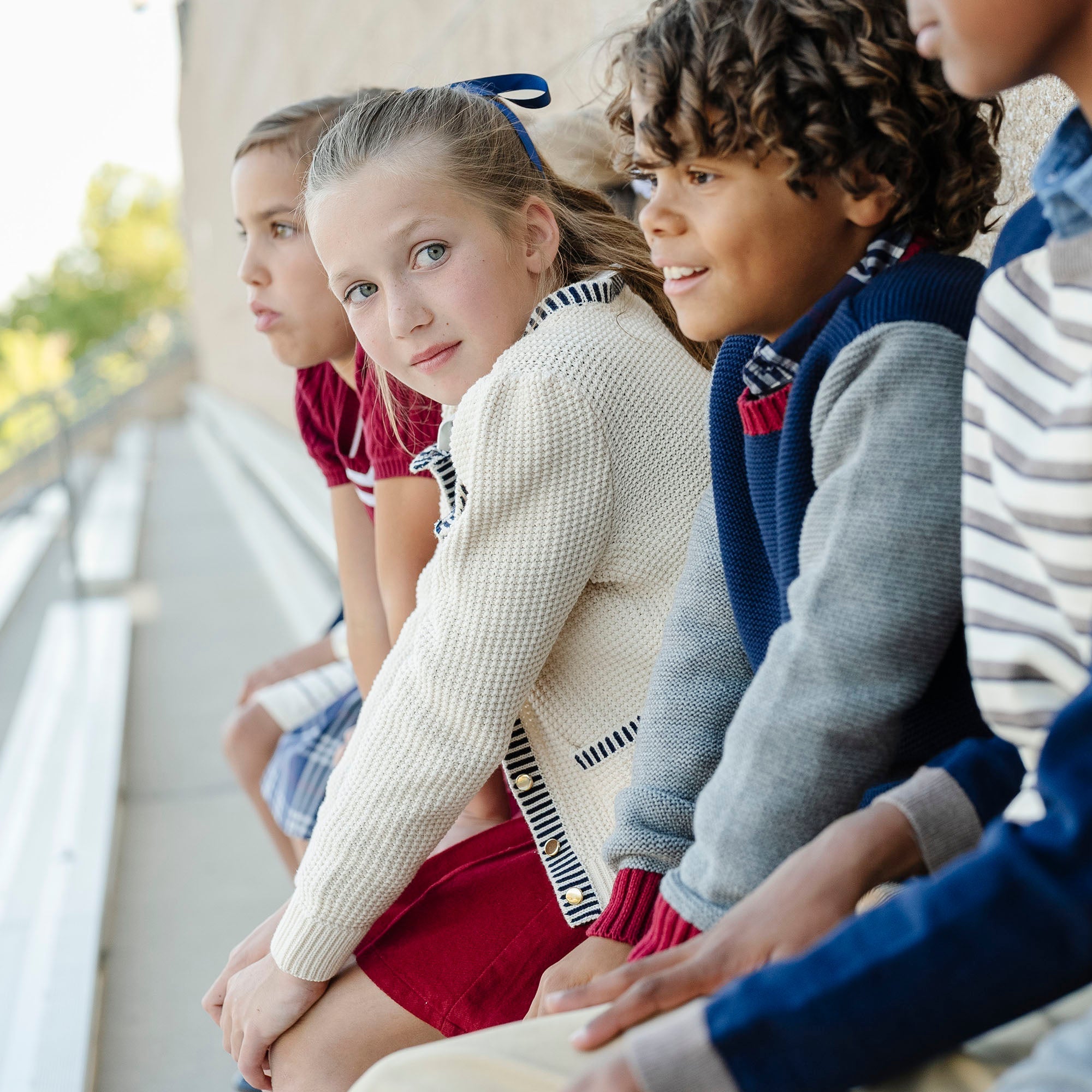Our sophisticated sweater cardigan in soft organic cotton is elevated by a beautiful tweed-like stitch. Features delicate puff sleeves, gold button closure, front patch pockets and welt pocket detail, and contrast trim. This piece pairs perfectly with our collection of organic cotton tops, skirts, and dresses for a polished look she'll love.