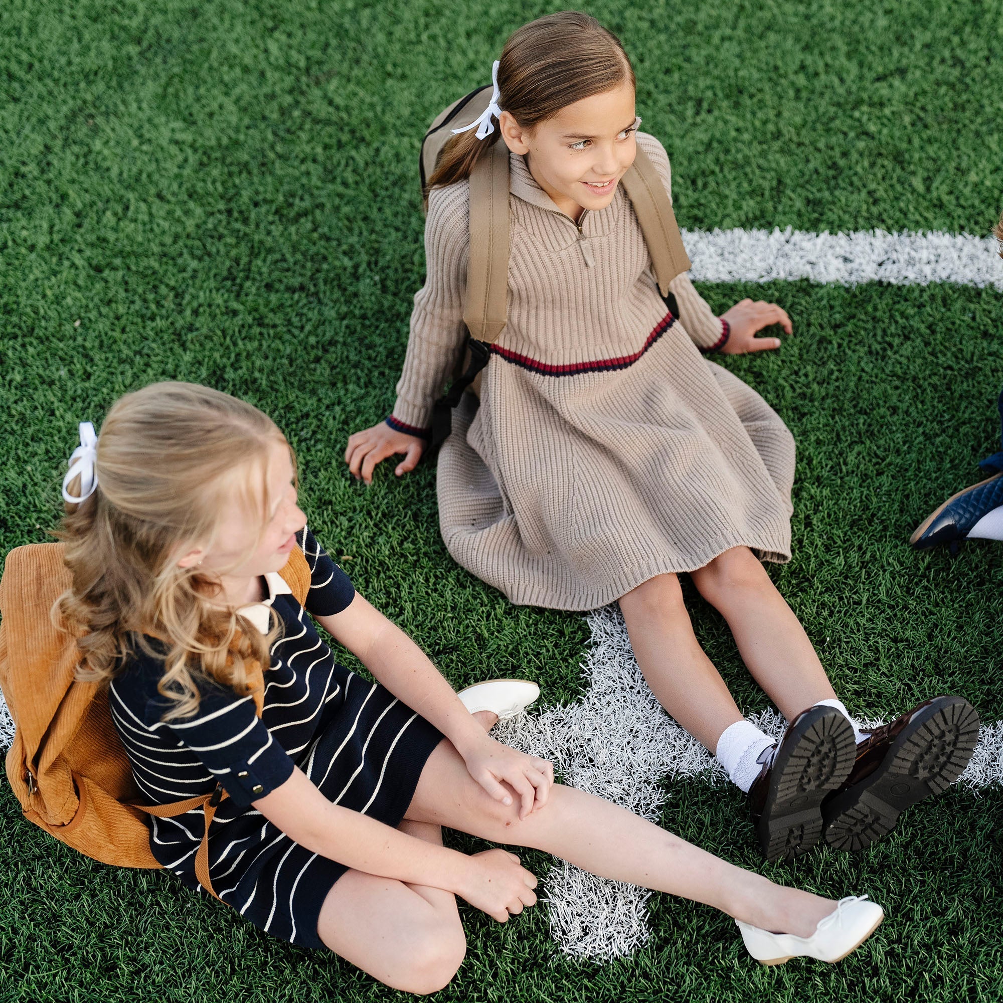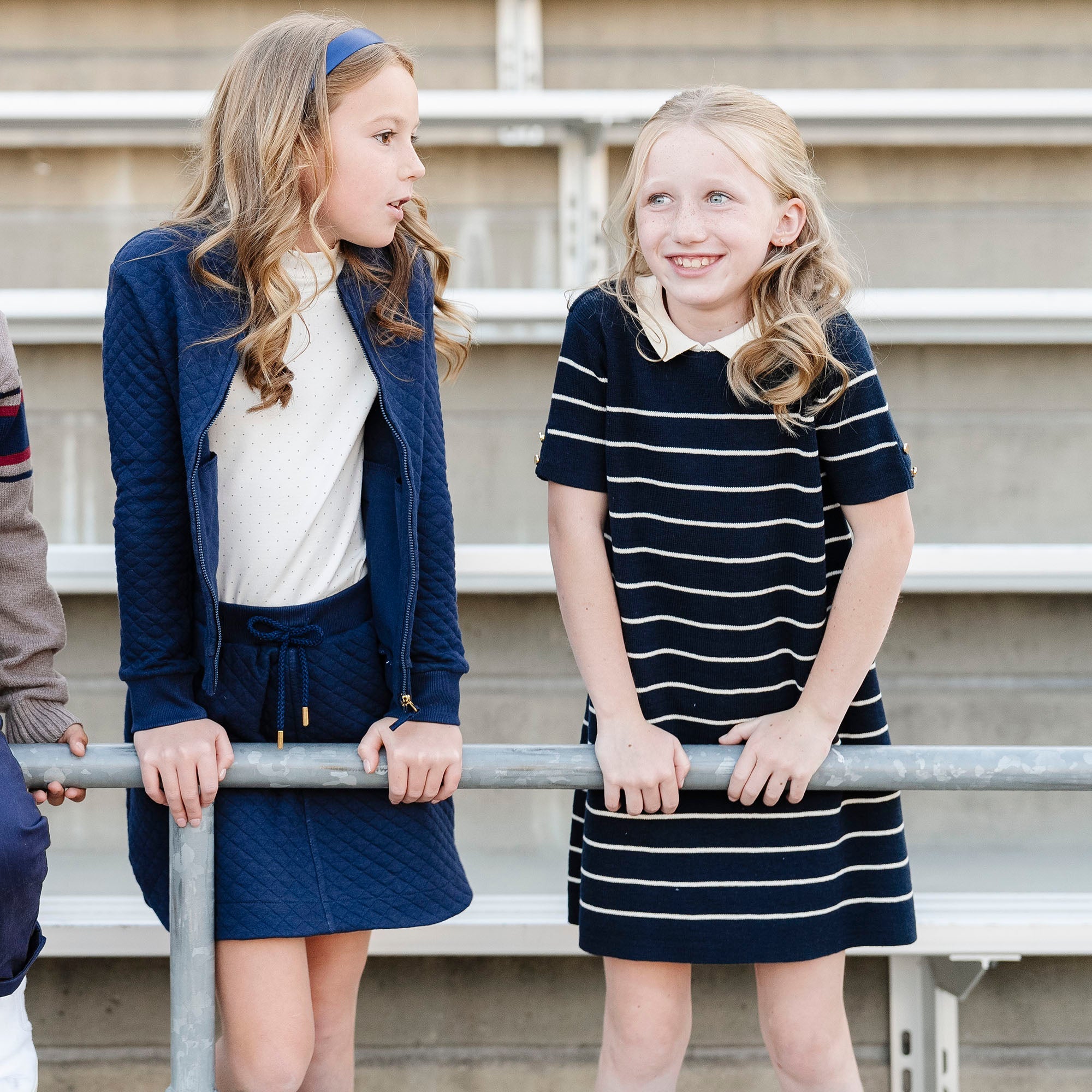 The perfect transitional fall dress for when school is back in session and the days can waver between warm to cool. Crafted from soft organic cotton in a beautiful full-bodied milano stitch. A knit peter pan collar and gold buttons at the back neck closure and cuffs add the finishing touch.