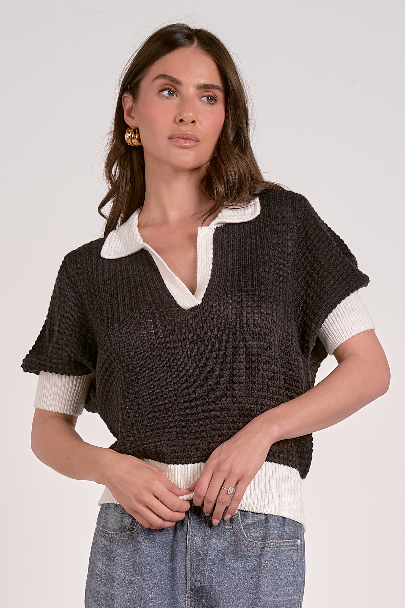 The Rita Top is a chic and modern piece featuring a collared design with a deep V neckline. Its 3/4 sleeves and contrasting color-blocked knit detail give it a timeless yet trendy appeal. Perfect for pairing with jeans or skirts, this sweater combines comfort and style effortlessly.
