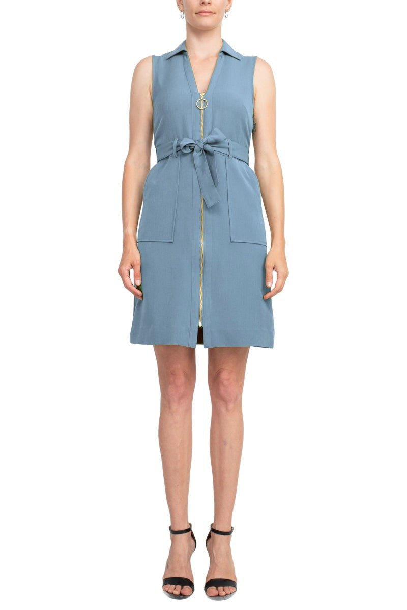 Sharagano Collared Sleeveless Zipper Front Tie Waist Solid Rayon Dress