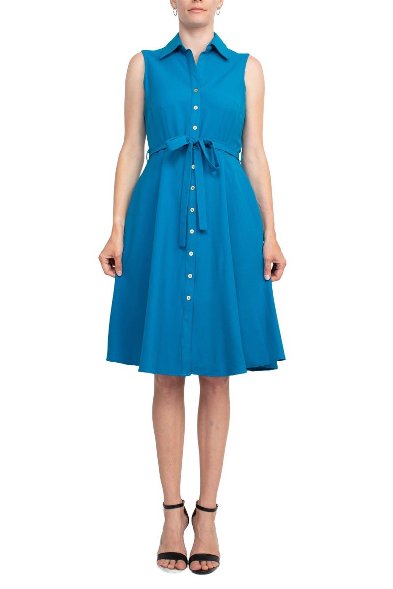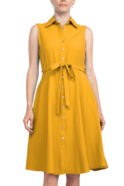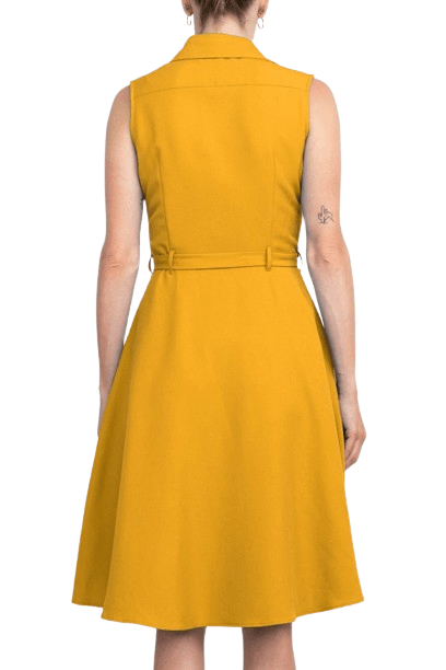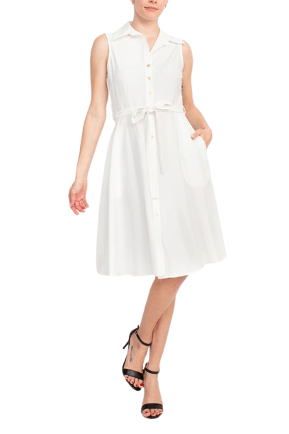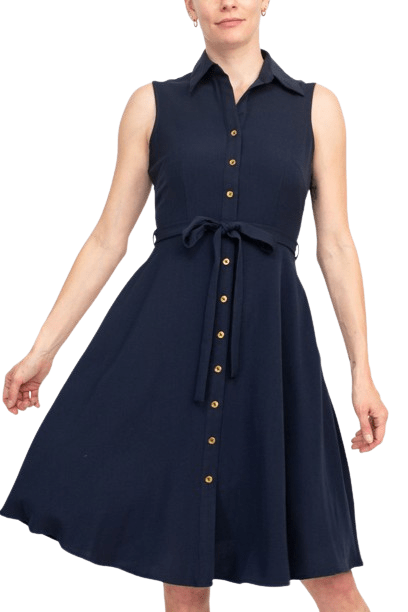Featuring a button-down collar and sleeveless silhouette, this dress exudes effortless refinement. The tie-waist waistband adds a touch of definition to the figure, while also offering a customizable fit that flatters your shape. Equipped with convenient pockets, this dress offers functionality along with its fashionable appeal.