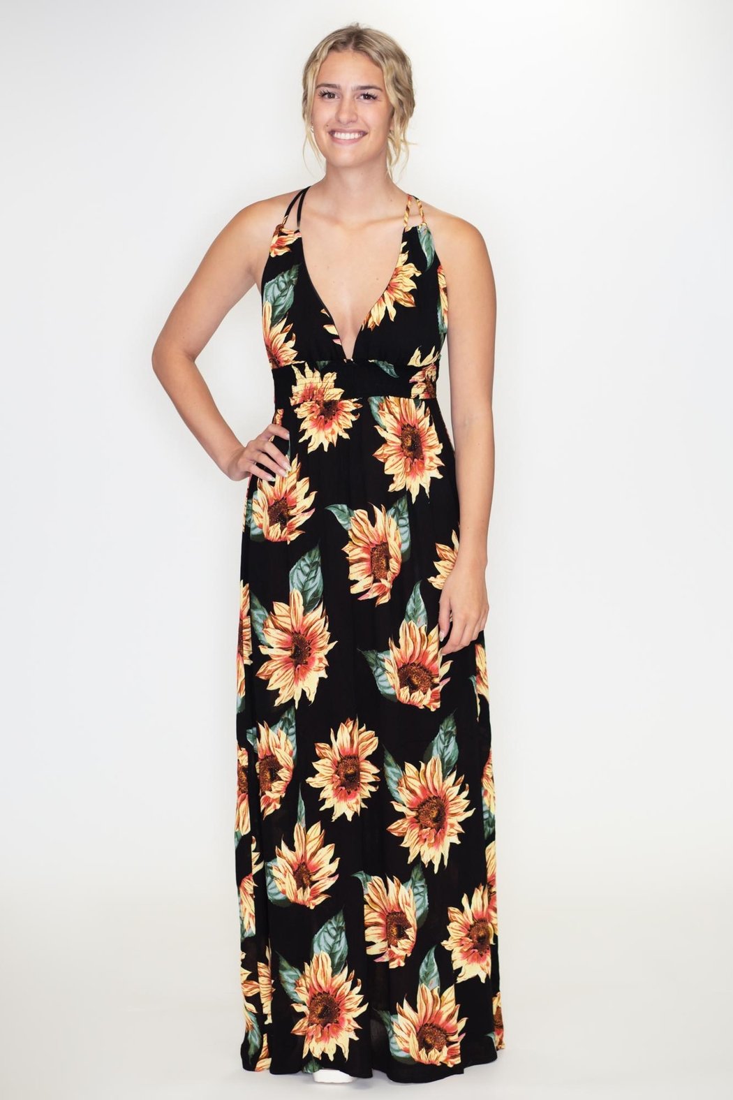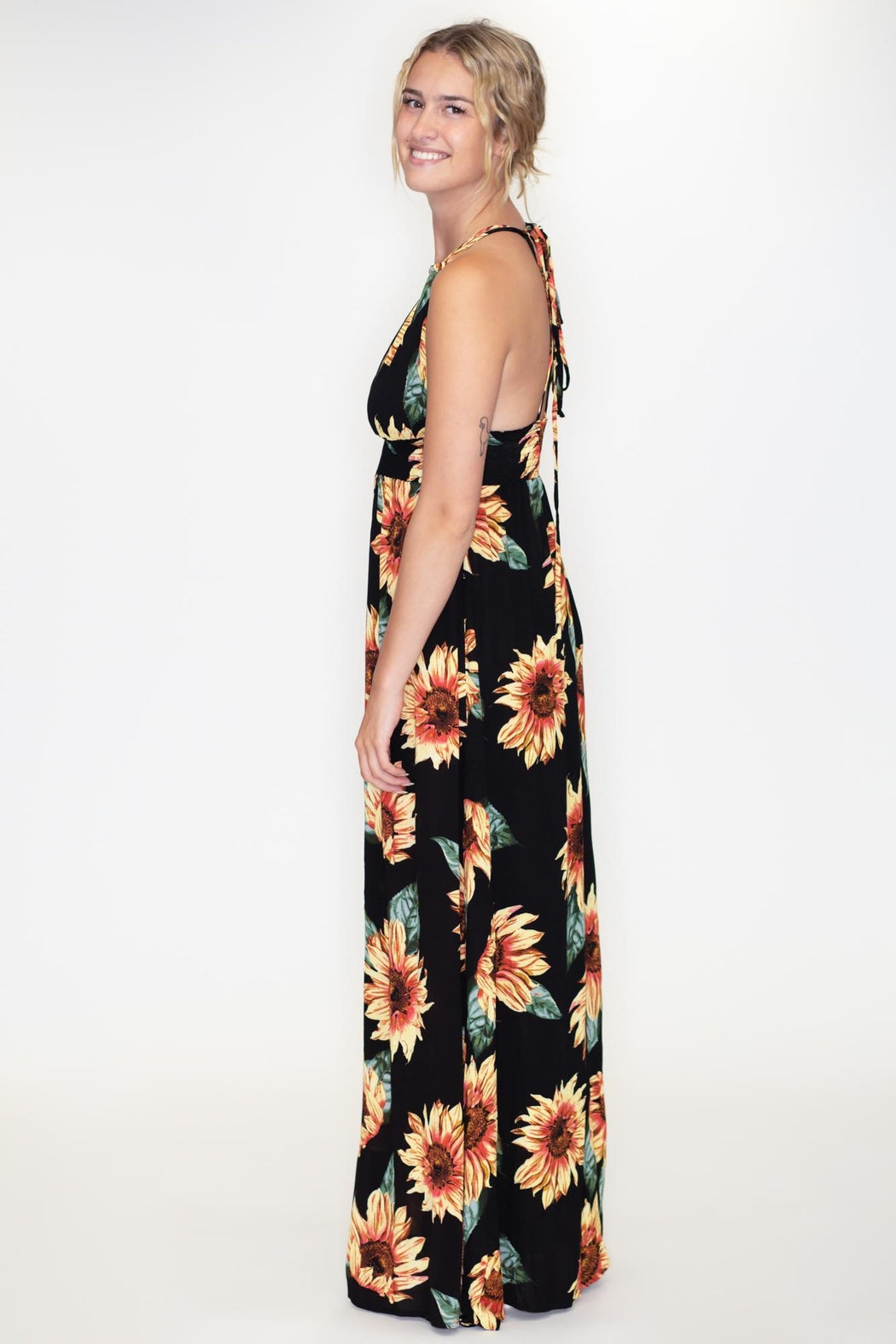 Halter sunflower maxi dress with side slit and self tie back detail.