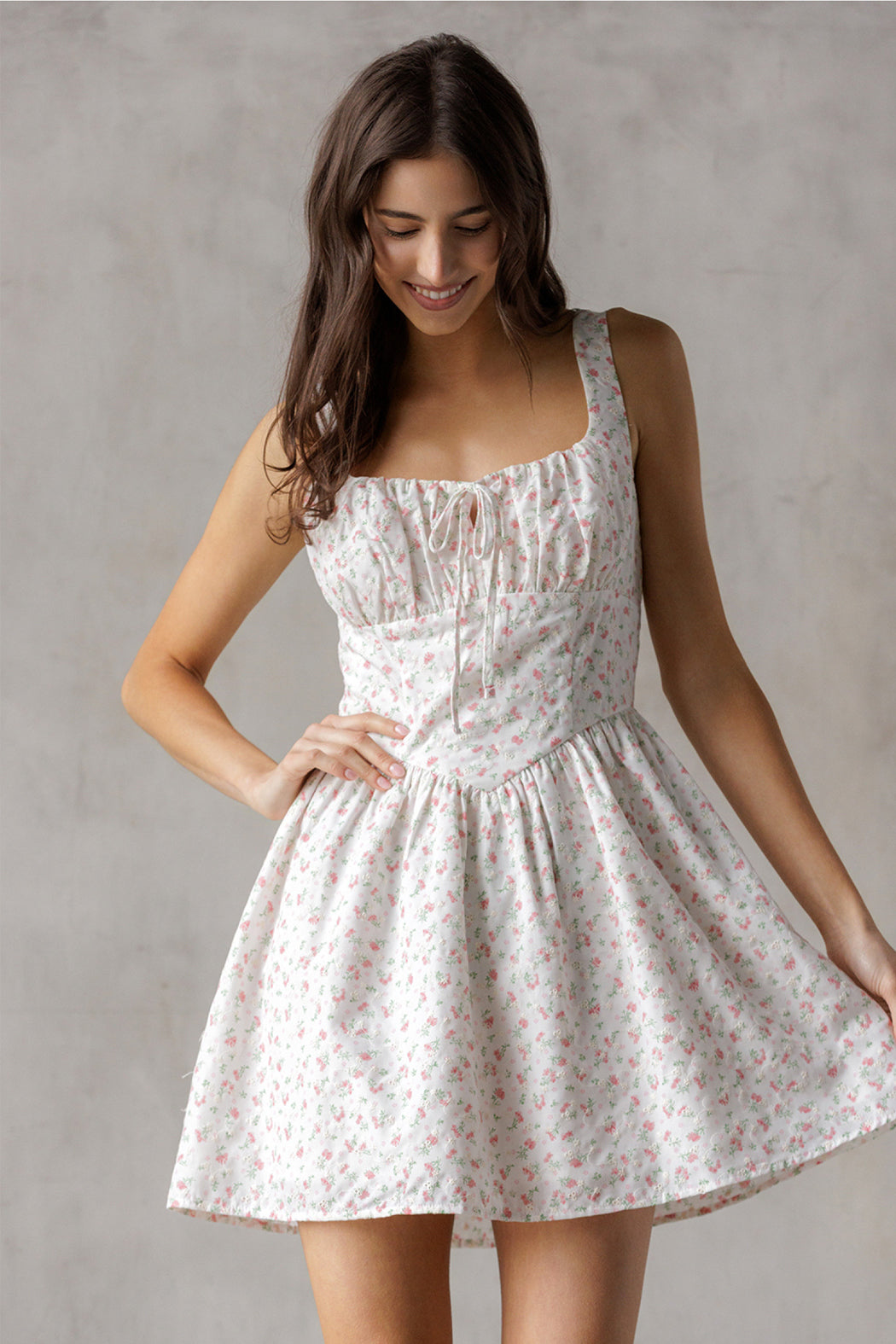 The Sweetie Floral Mini Dress combines a sweet and feminine style with its soft pink floral print on a white base. Designed with a sweetheart neckline, gathered bust, and a dainty front tie, it offers a charming look. Wide shoulder straps and a squared back provide structure, while the smocked back panel ensures a comfortable, flexible fit. Perfect for casual outings or warm weather occasions. Follow @lunaboutiquecanton on instagram and DM us with any questions :)