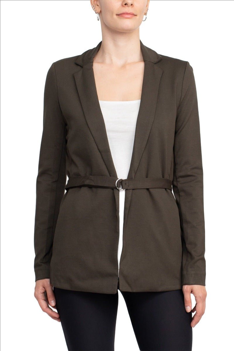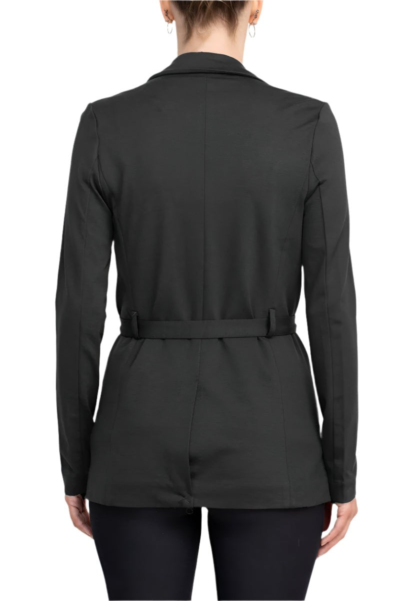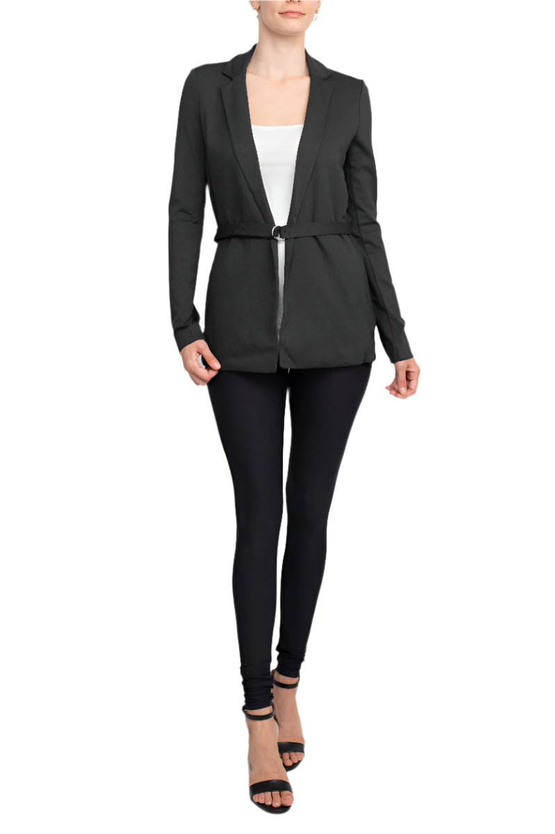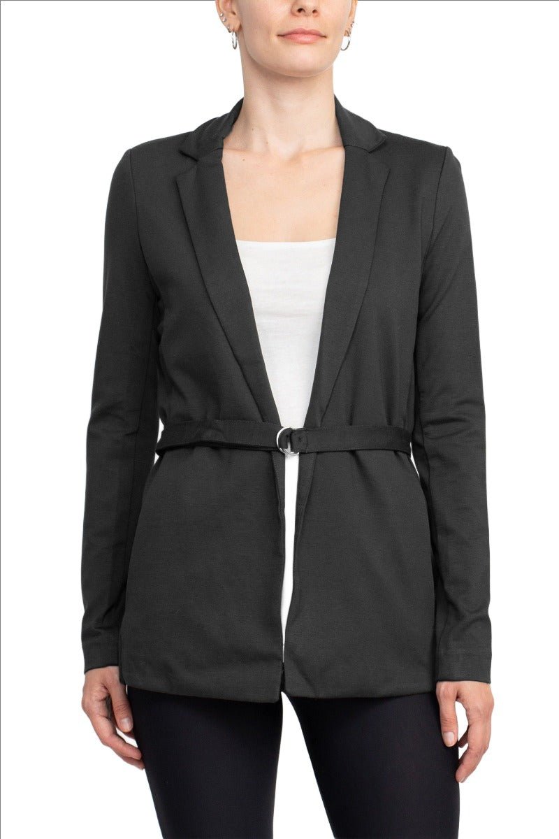 Crafted from a soft and stretchy knit blend (67% Rayon, 29% Nylon, 4% Spandex), it offers comfort without sacrificing structure. The sharp notched collar frames the neckline with authority, while the open front design and long sleeves maintain a clean, modern look. A standout ring-style waist belt cinches at the waist, creating a flattering, feminine silhouette that defines your shape and elevates your ensemble.
