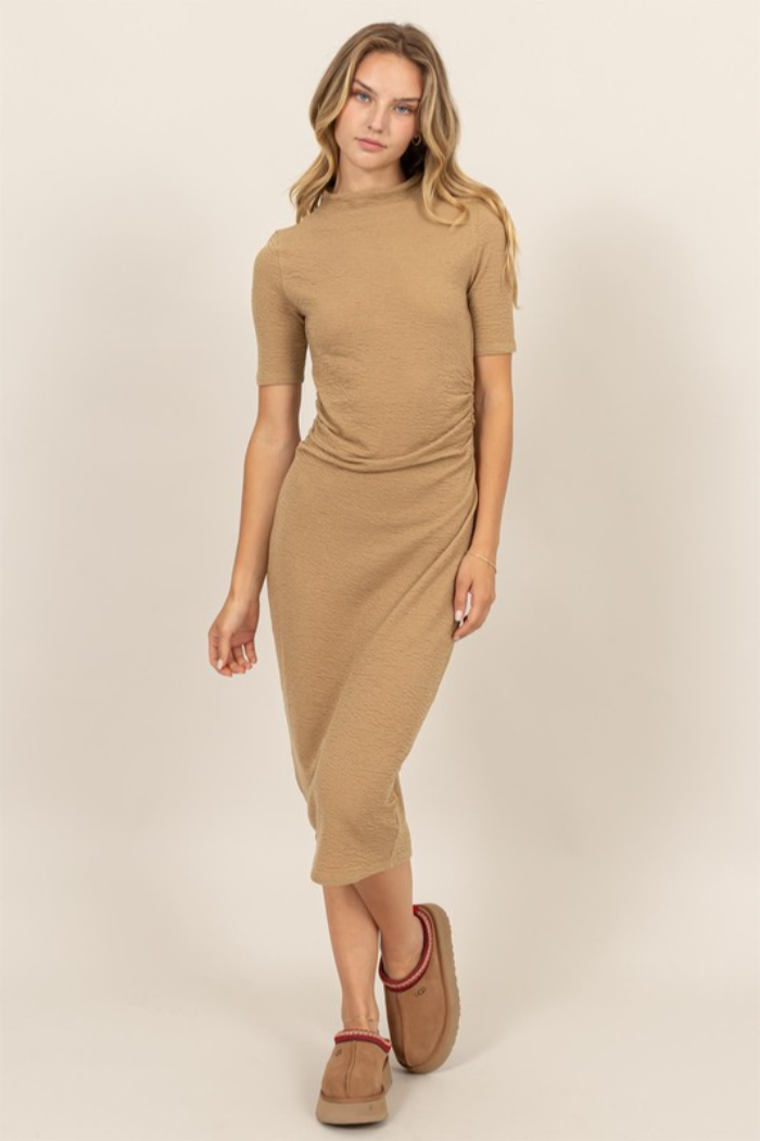 THE TEXTURED MIDI DRESS OFFERS A PERFECT BLEND OF SIMPLICITY AND ELEGANCE. FEATURING A HIGH NECKLINE AND SHORT SLEEVES, THIS DRESS IS IDEAL FOR BOTH CASUAL AND DRESSY OCCASIONS. THE TEXTURED FABRIC ADDS A TOUCH OF SOPHISTICATION, WHILE THE SLIM FIT SILHOUETTE ENHANCES YOUR NATURAL SHAPE. THE MIDI LENGTH PROVIDES A MODEST YET STYLISH LOOK, MAKING IT SUITABLE FOR VARIOUS EVENTS. THE BACK VIEW SHOWS THE CONTINUATION OF THE TEXTURED DESIGN, ENSURING A COHESIVE AND POLISHED APPEARANCE FROM EVERY ANGLE. PERFECT FOR PAIRING WITH HEELS OR FLATS, THIS DRESS IS A VERSATILE ADDITION TO ANY WARDROBE.