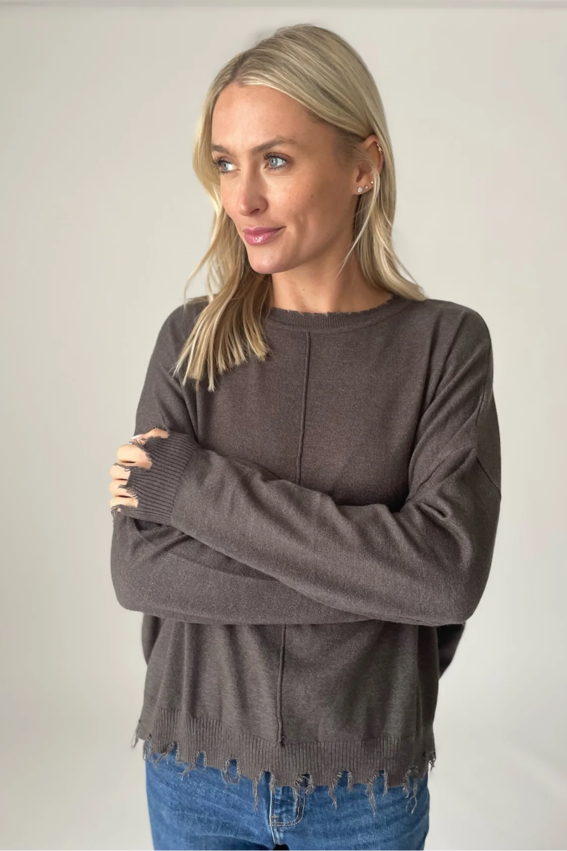 Amazingly Soft Long Sleeve Crew Neck Sweater with tattered hem collar and cuffs.