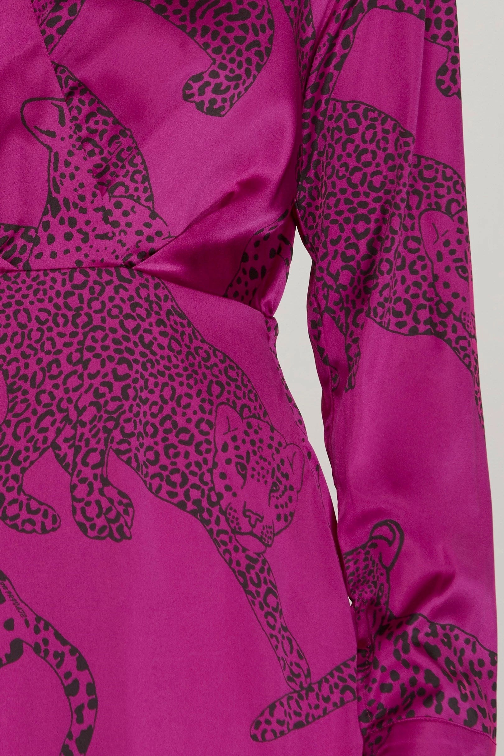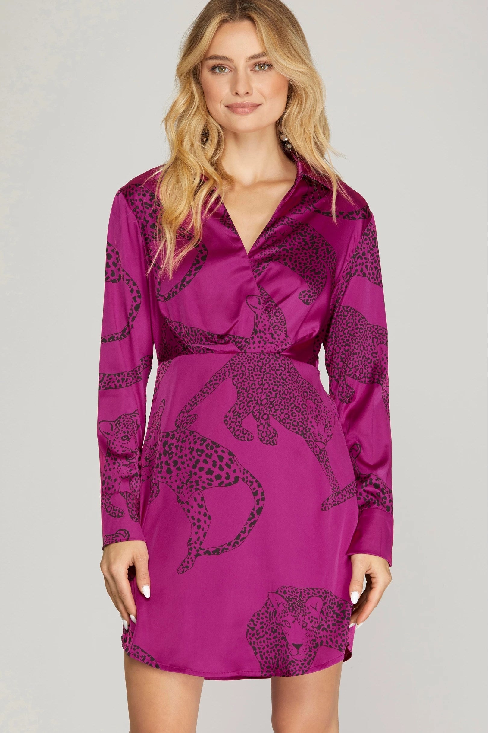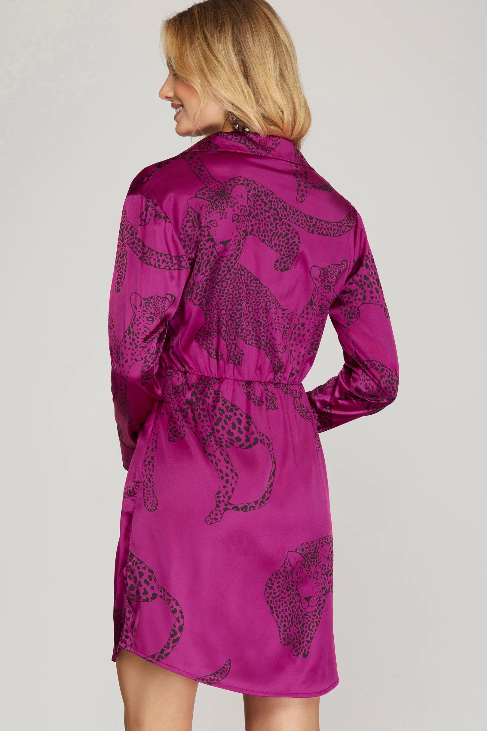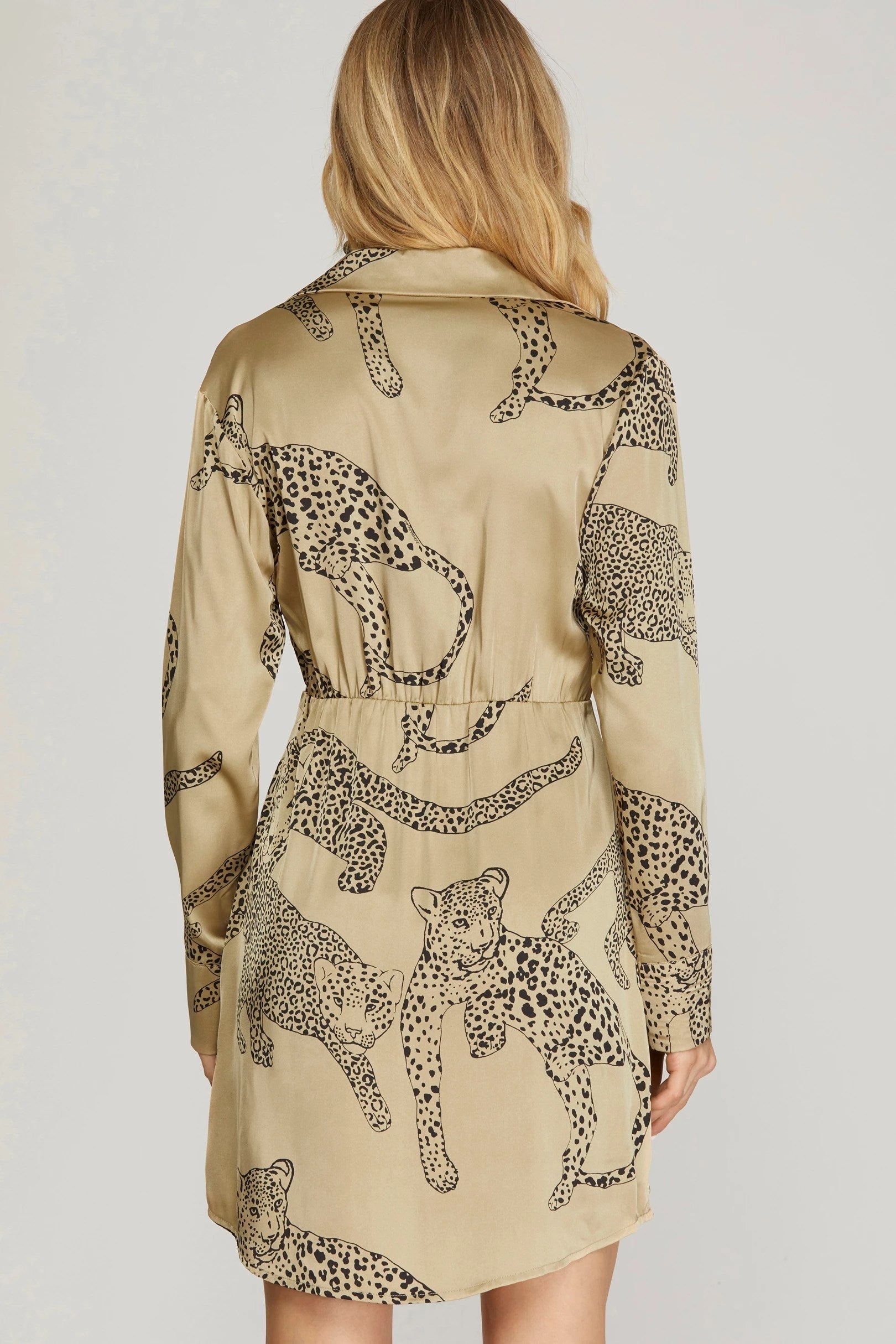 LONG SLEEVE WOVEN SATIN CHEETAH PRINT COLLAR DRESS