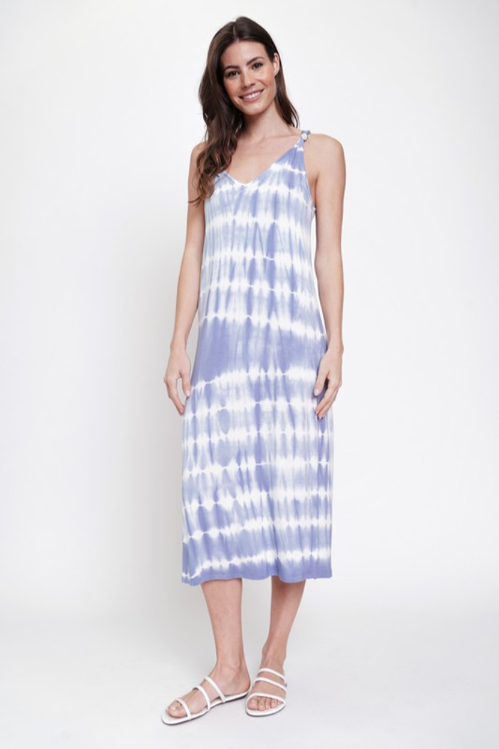 This dress features: - Marble Tie Dye - Shoulder Knots - Sleeveless - V-neckline in front and back - Midi length - Shift dress