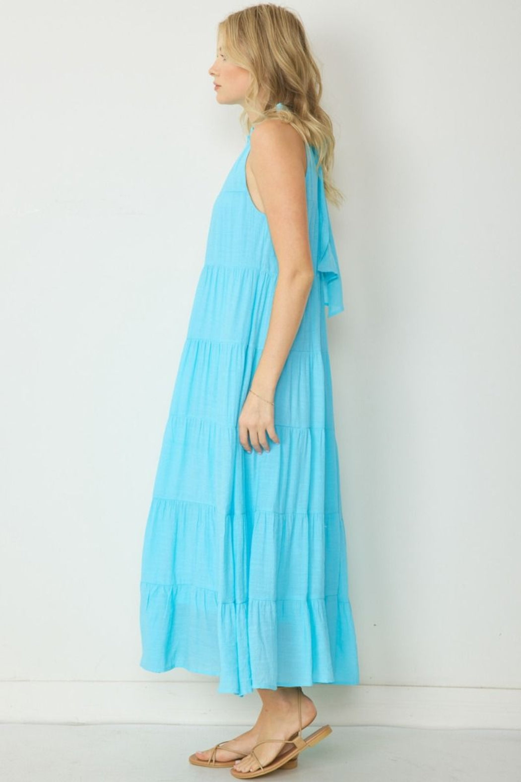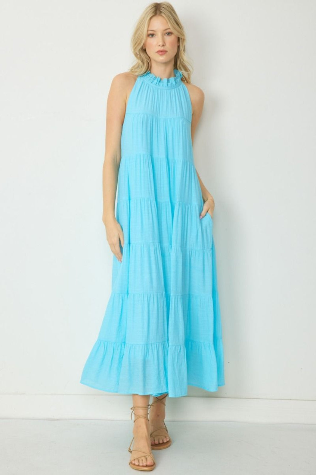 Our solid mock neck sleeveless Tiered Maxi Dress features a self tie closure at back and a ruffle detailed neckline. It is fully lined, non-sheer and has side pockets.