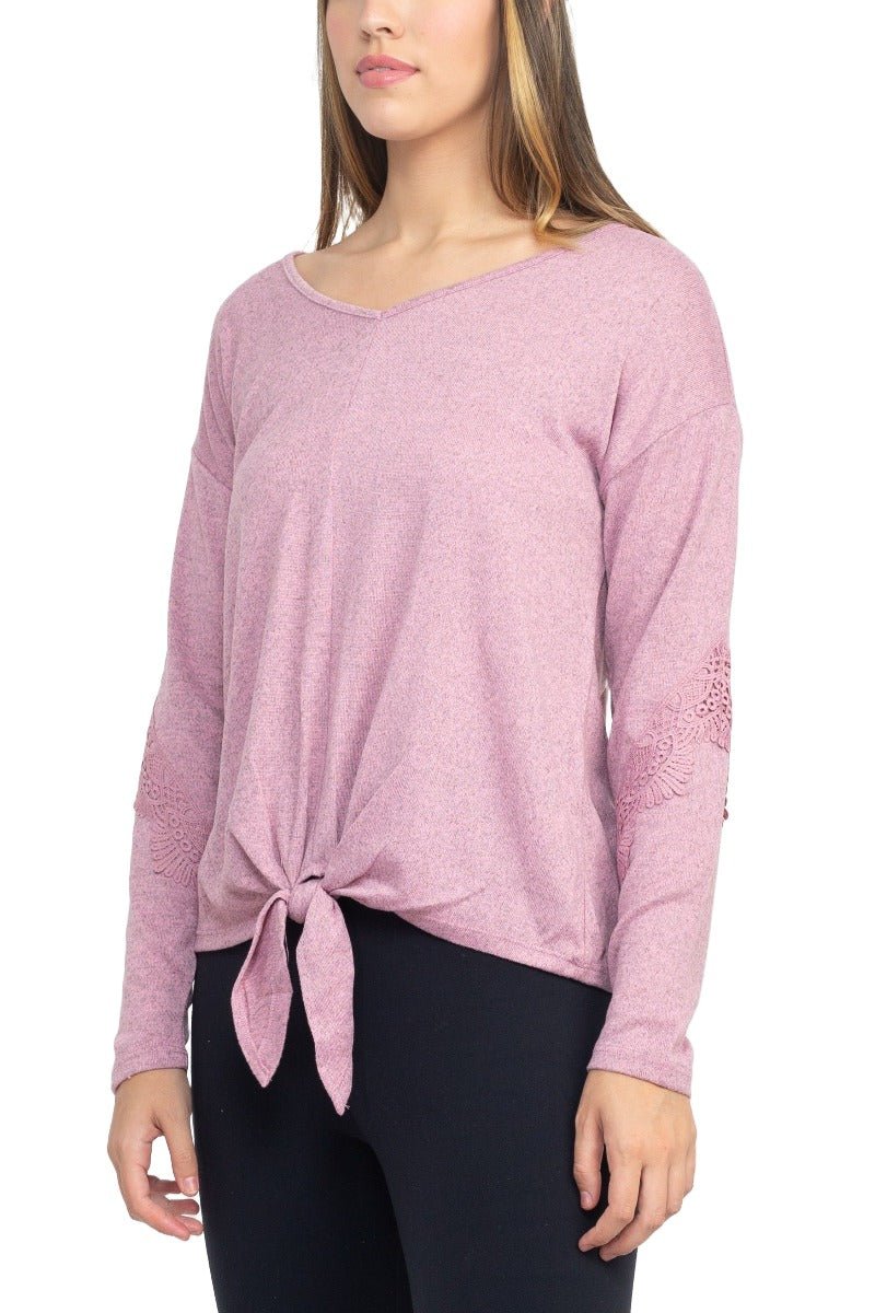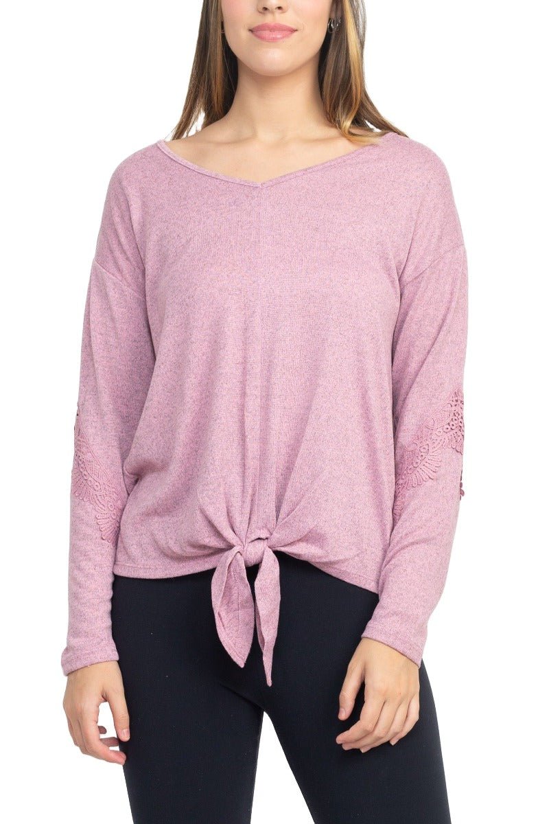 Why Choose the Tint + Shadow Boat Neck Long Sleeve Tie Front Hem Solid Knit Top?