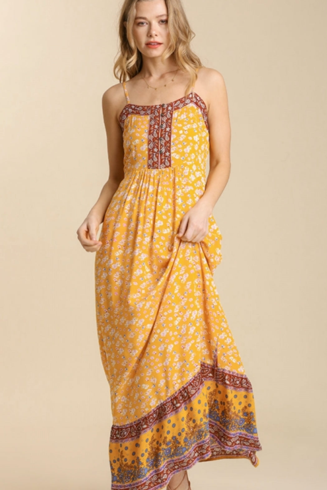 Mixed Border Print Half Button Front Sleeveless Ruffle Hem Maxi Dress 100% Rayon