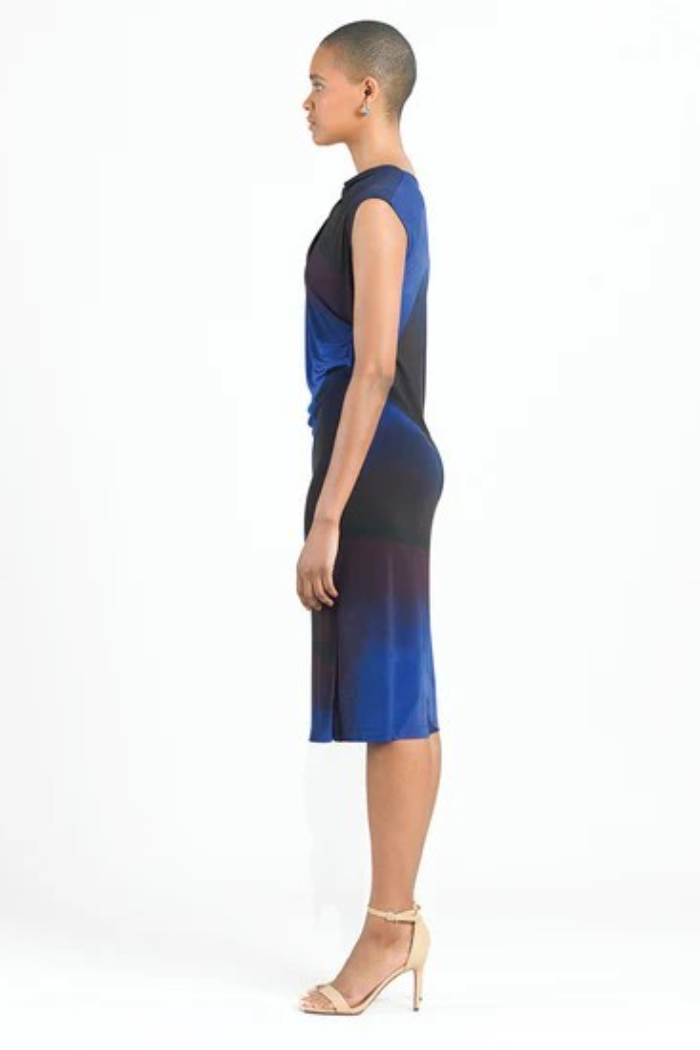 How gorgeous is this watercolor side slit midi dress? It has a gorgeous high draped neckline with cap sleeves and ruching detail on the side that creates a flattering silhouette. It also has a side slit. The colors are absolutely stunning with purple, eggplant, navy, cobalt, and black. Each piece is unique and one of a kind. This dress can easily be paired with a jacket on a cooler day. It is wrinkle free and travel friendly.