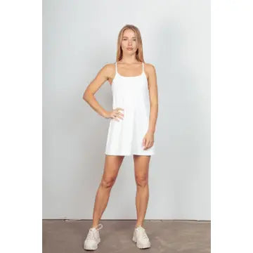 Get ready to dominate the tennis court in this White Sleeveless Active Tennis Mini Dress. Built for peak performance, this 90's Key Item Racerback Fashion dress features 4-Way Stretch, Performance Knit for ultimate flexibility and comfort. The dress also boasts an elastic waistband and adjustable spaghetti straps for a customizable fit. With built-in shorts and side pockets, you'll have everything you need to stay focused and win. Whether it's a casual summer essential or a basic spring essential, this slip-on design dress is a must-have for your wardrobe.