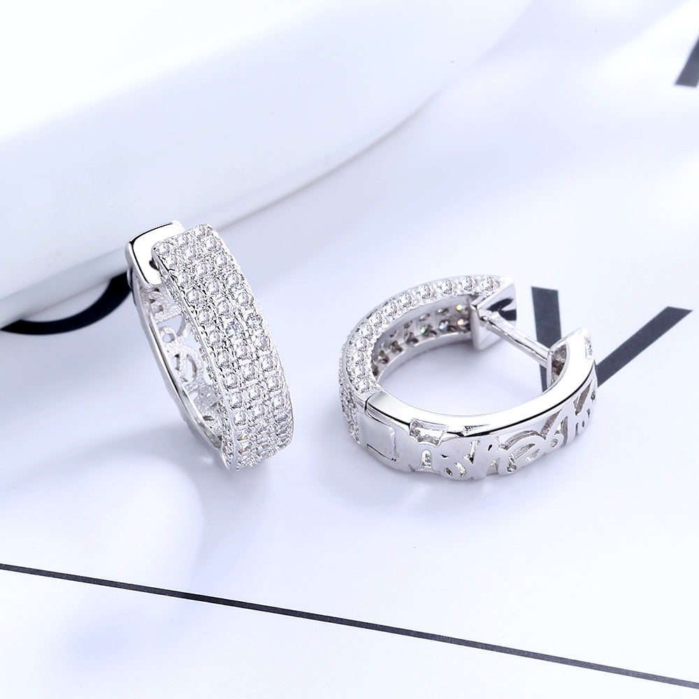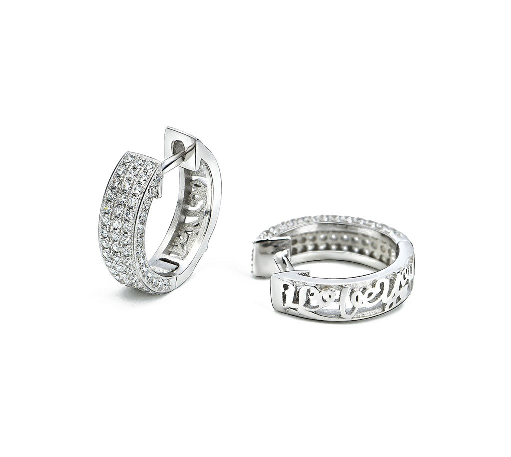 Our earrings are perfectly designed to go with any outfit. The intricate "I Love You" Pavé Huggie Earrings are not only perfect for special occasions but can also be worn any time of the day. They go with everything, any occasion—from office to fancy event. Everyone will compliment these earrings! The shiny silver color makes them perfect for everyday wear and they are sure to add some glamour to any look. Our fashion earrings are made up of high-quality material that is nickel-free and they will keep your style up to date. They are waterproof and stay in place so that you can wear them all day long. The earring are waterproof, lasting 10 times longer than ordinary clips!