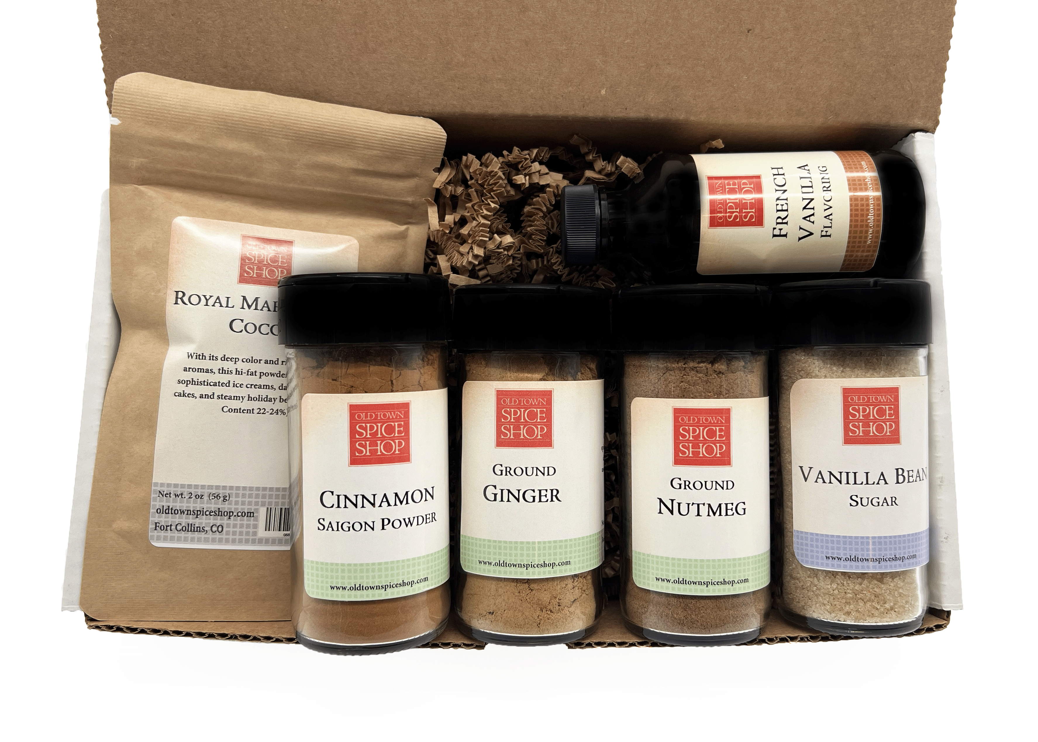 Included in White Gift Box: 2 oz Bag Royal Mahogany Cocoa Powder, 4 oz Bottle French Vanilla Flavoring, 1.5 oz Jar Saigon Cinnamon Powder,1.6 oz Jar Ground Ginger Root, 3.8 oz Jar Vanilla Bean Sugar, 1.8 oz Jar Ground Nutmeg