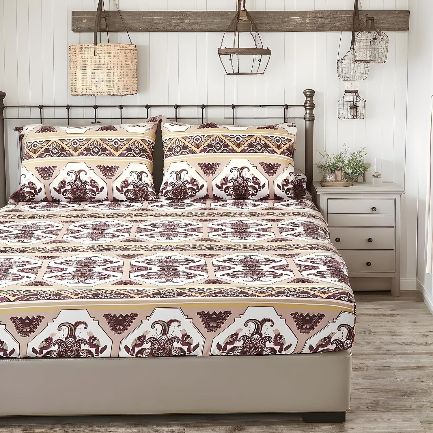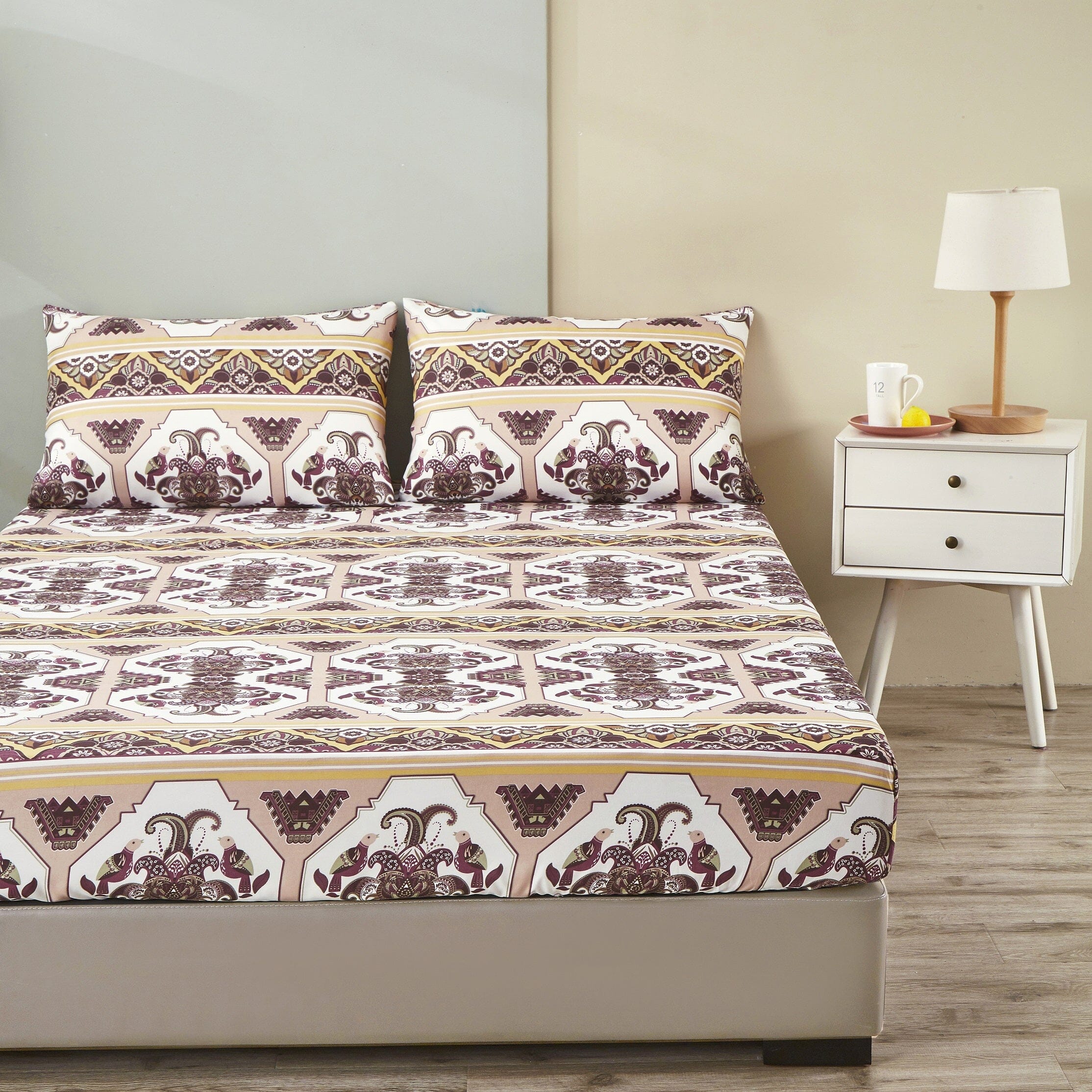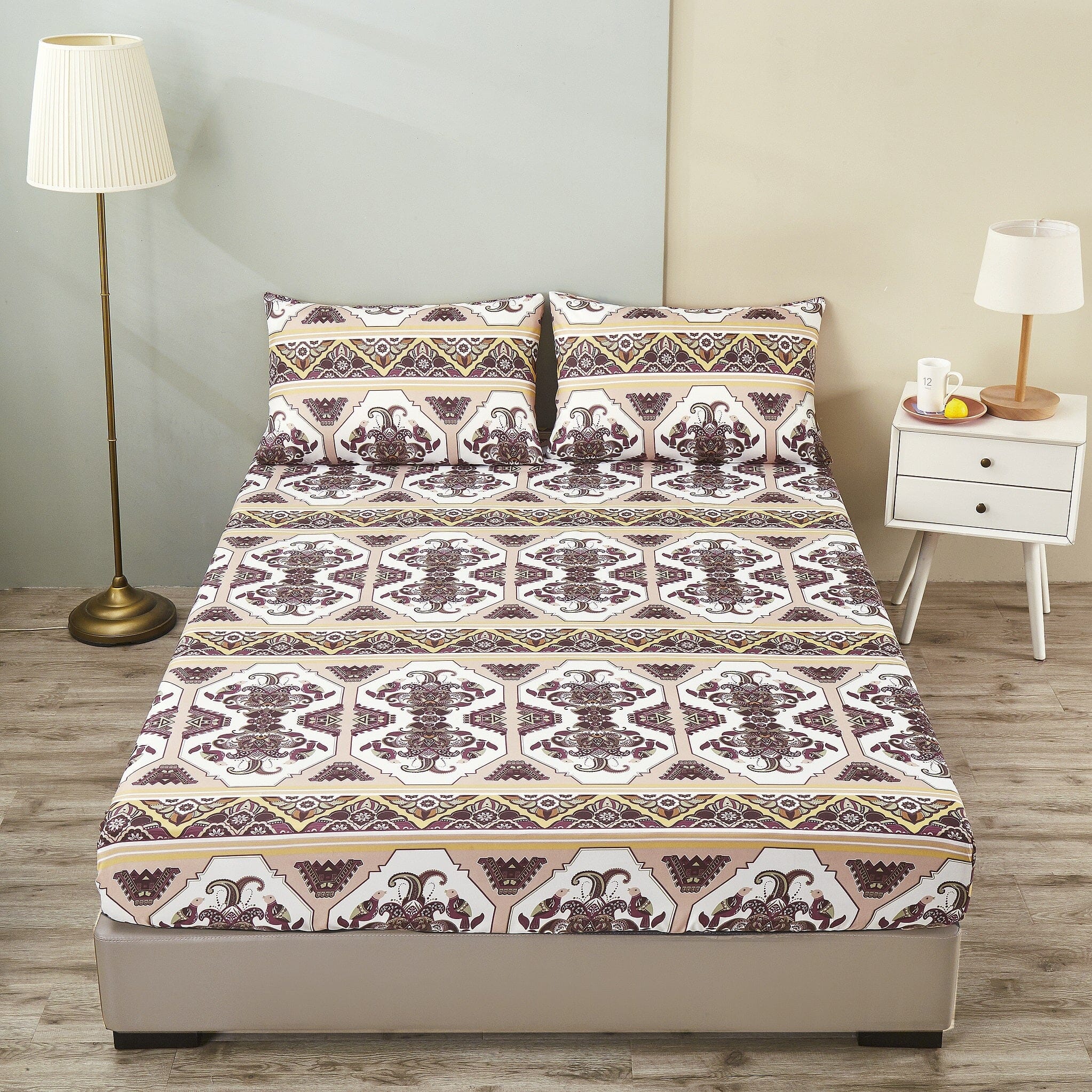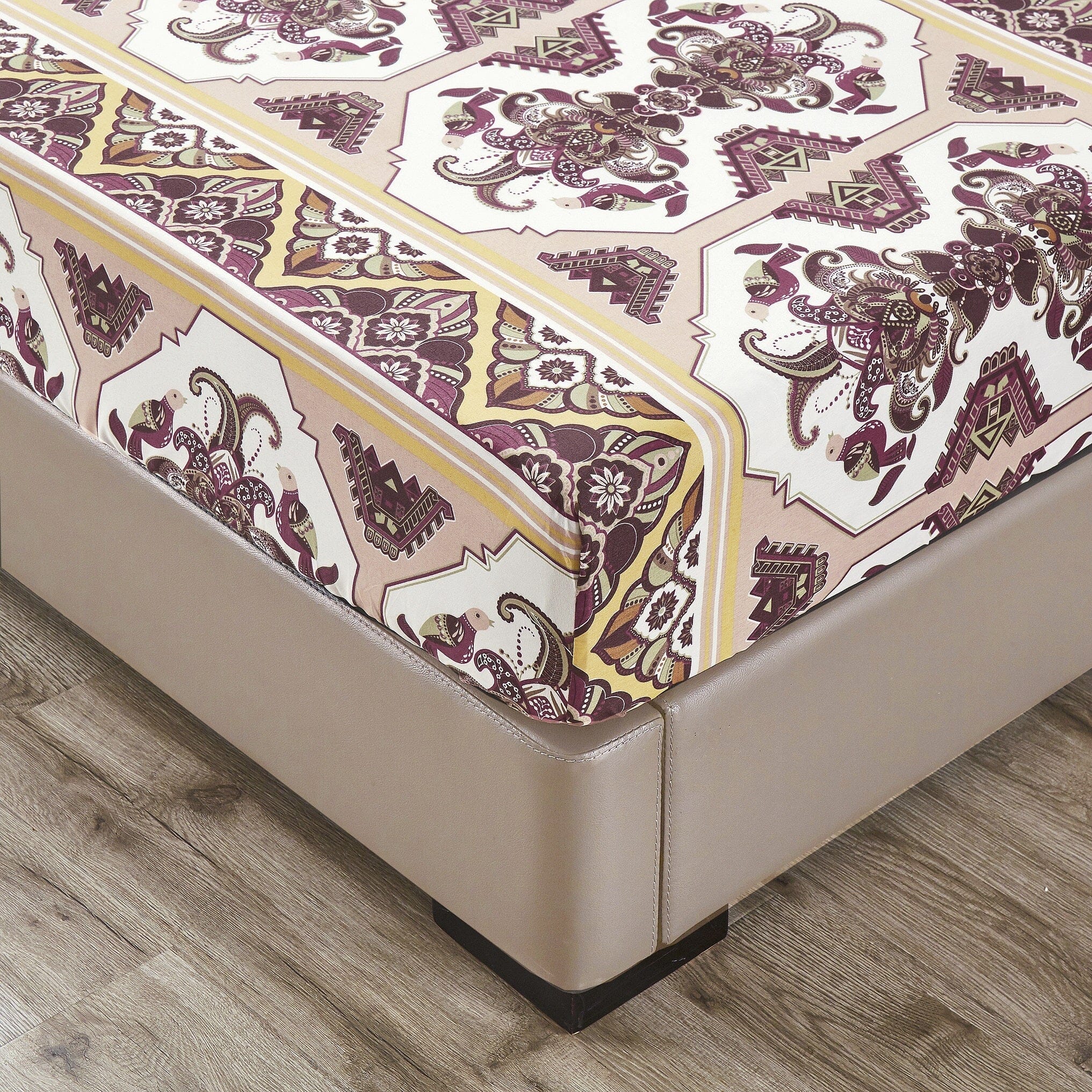 Our Contour sheet is accented with Kilim inspired patterns with hints of purple, pink, mustard shades and more, showing off a bright atmosphere.