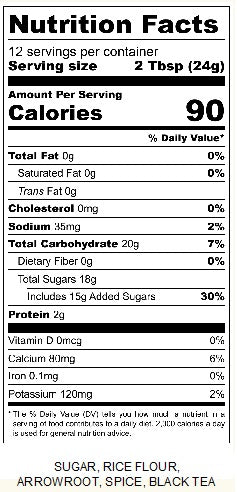 Ingredients: Sugar, Rice Flour, Arrowroot, Spices, Black Tea