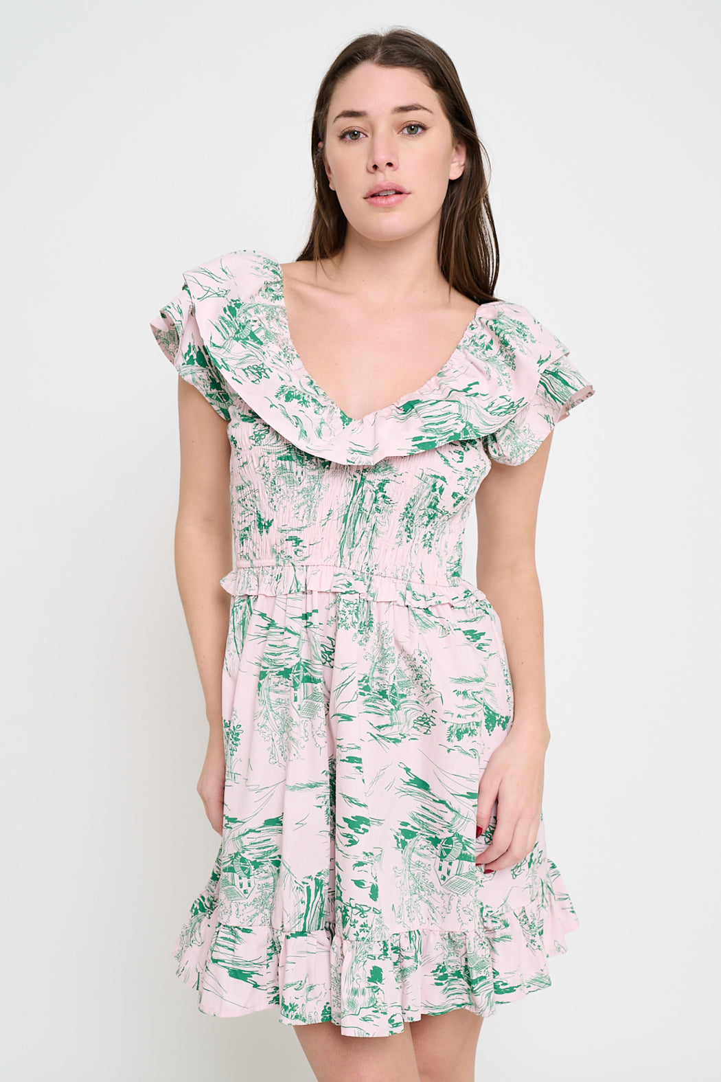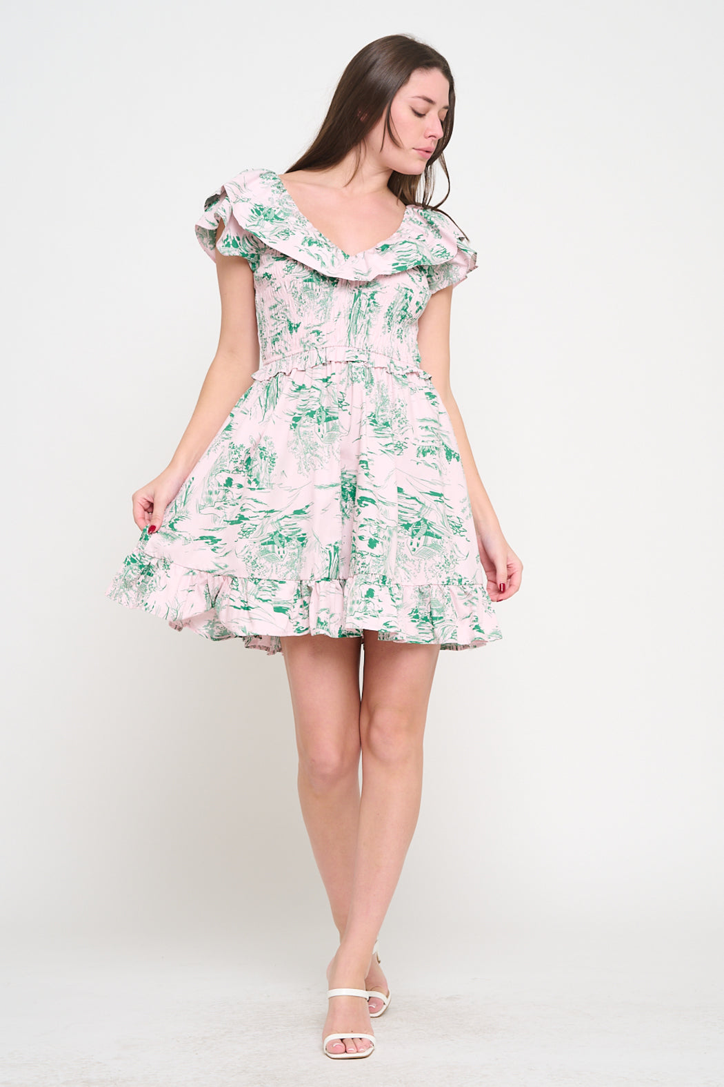 Embrace effortless elegance with this smocked ruffle mini dress, featuring a delicate ruffled neckline, cap sleeves, and a flattering smocked bodice. Designed with a flowy silhouette and soft ruffle hem, this dress offers a feminine and romantic feel, perfect for brunch dates, vacations, or summer soirées. The lightweight fabric ensures all-day comfort, while the playful print adds a chic touch. Pair it with sandals for a casual vibe or heels for a dressy look. A must-have for your warm-weather wardrobe!