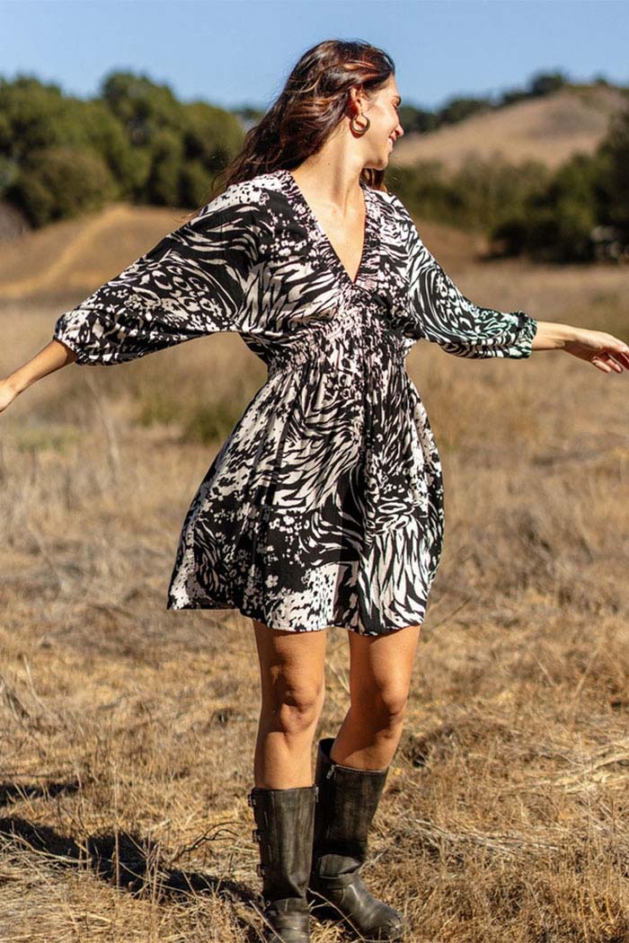 A Billowy Sleeve V-Neck Babydoll Mini Dress, fashioned from floral/animal rayon crepe. This dress stands out with its smocked waist and neckline, two-button back closure, and smocking panels with elastic loops, all complemented by hidden side pockets, elastic cuffs, and a chic straight hemline.
