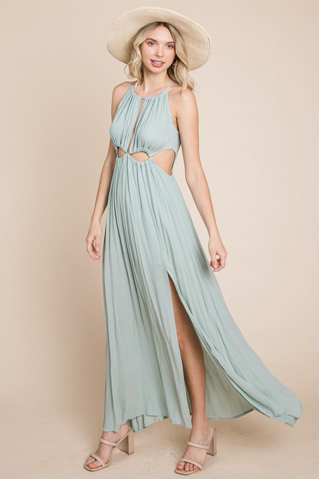 Features: Split Front, Cut out Front and Back, Front Self Lined, Partially Inner Lining, Waistband in the back, Maxi Length, Pleated, Adjustable Neck Tie Strap, Sleeveless Model is 5.7"(32B 24 34) wearing small- Front Length 56 Bust 36 dress, dresses, dresses for women, maxi dress, cut out maxi dress, halter dress, split dress, sleeveless dress, formal dresses, cocktail dress, pleated dress