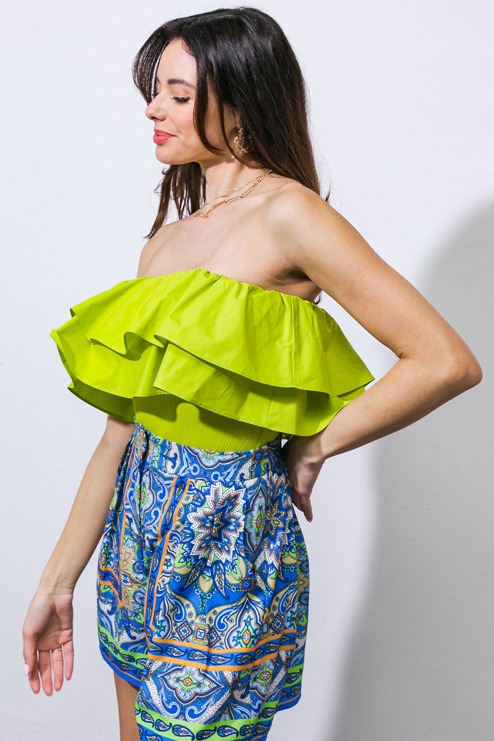 Indulge in the luxurious style of our STEPPING OUT KNIT BODYSUIT, crafted with a solid poplin and ribbed knit design. This sophisticated piece features a strapless neckline, a double flounce, and a convenient bottom snap closure for an effortless and elegant look.