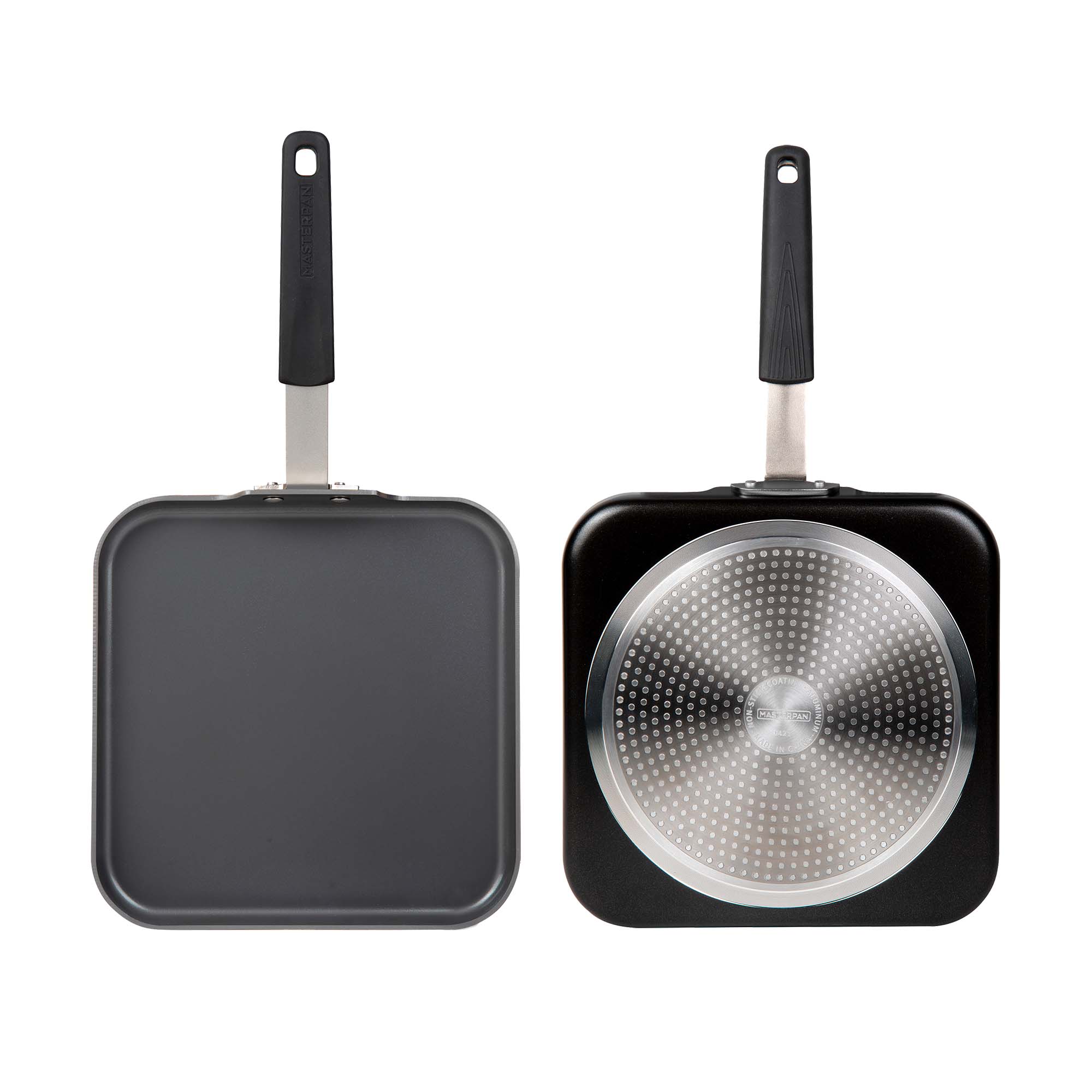 The MASTERPAN 11" (28cm) Griddle Pancake Pan is a must have for any kitchen and is crafted from cast aluminum with a riveted stainless steel handle and removeable silicone handle cover, and then finished with a premium ceramic non-stick coating. It has a perfect flat surface and  low walls for easy access but still prevent any spillage when frying, making it the ideal pan for crepes, pancakes, tortillas, rotis, eggs, quesadillas, and much more. The sleek style and ultra durability fulfills all your cooking desires.   Part of our Chef’s Series, the pan boasts a streamlined look with a smooth, hard surface and stainless steel handle making it an ideal addition to any kitchen and your cooking needs. Cookware that is guaranteed to perform as amazing as it looks! Riveted handle provides added support and removable, silicone handle cover is versatile for using in and out of the oven.