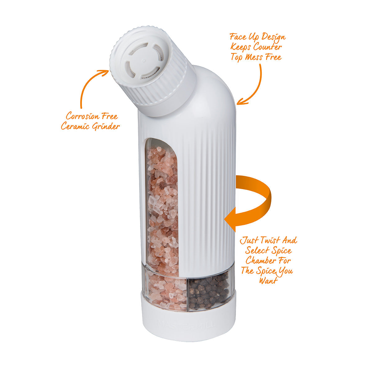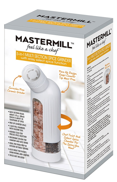 Introducing our patented 5-in-1 Multi Section Spice Grinder & Dispenser under our MASTERMILL brand. Tried, tested and loved by Chef Mike Ledesma of the Perch restaurant in Richmond, Virginia, the MASTERMILL easily loads with upto 5 different spices in 1 compact unit allowing you to use as you please by simply selecting the chamber with the desired spice and grinding as much as you need and then turning chambers for the next spice you need and using that. Be able to use salt, pepper, cumin, corriander or cumin all from the same grinder. Watch our video to see how easy and convenient it is to use the MASTERMILL. By cutting out the age old tradition of multiple middleman and retailers we contract manufacture all our kitchen tools directly with quality manufacturers and then sell them straight to you at an affordable price. Simply put - Amazing Quality at Affordable Pricing.