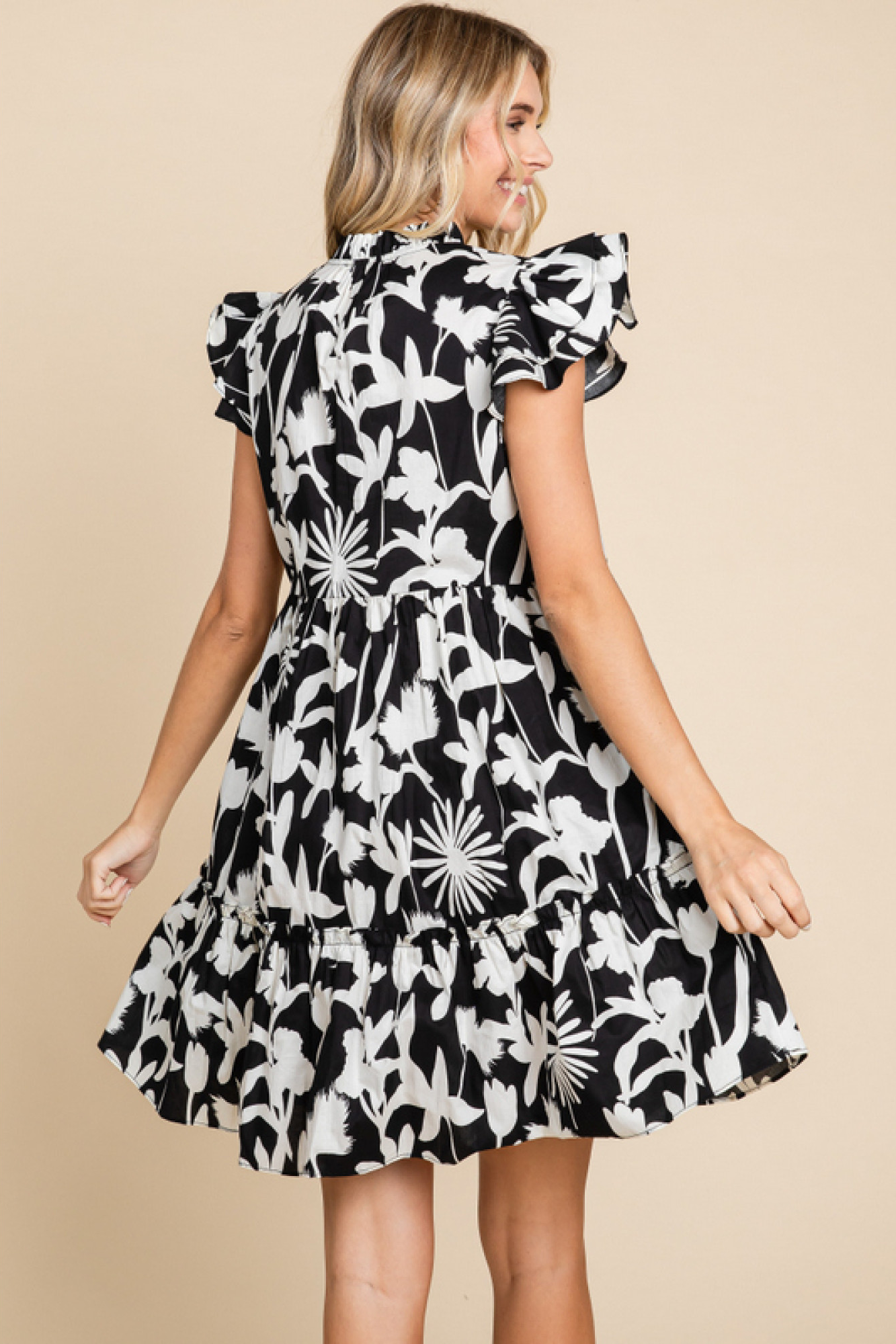 Flower print baby doll dress with slit neck, layer ruffled cap sleeves, side pockets, and frilled detail. - Unlined, non-sheer, lightweight. - Model is 5'8'' and is wearing a Small.