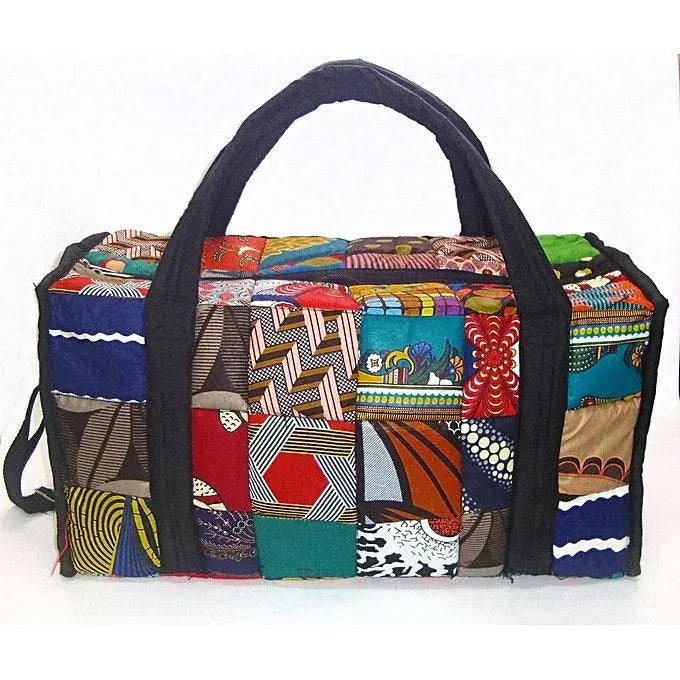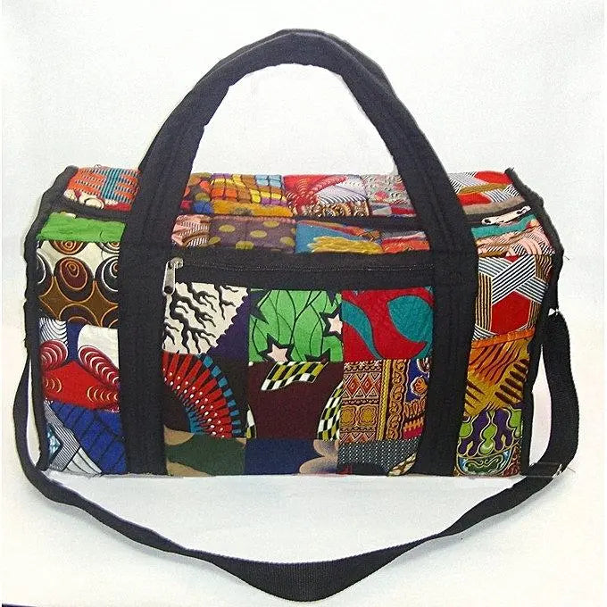 This Patchwork kitengi duffel bag measures 18" x 10" x 10" and it's made with African Kitengi Fabric! It also has an outside zippered pockets and easy to carry 6" handles and an adjustable/removable shoulder strap.