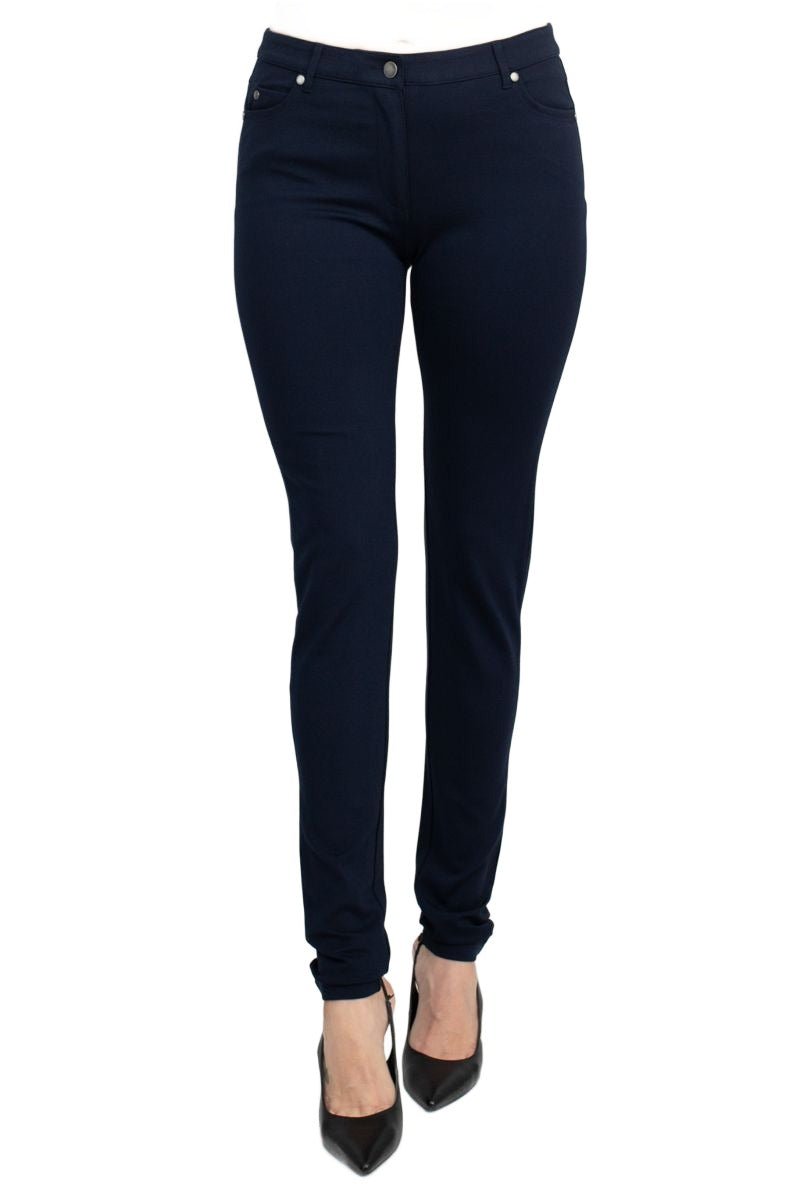 Crafted from a soft stretch crepe blend (63% Viscose, 33% Nylon, 4% Spandex), this pant features a mid-rise waist, belt loops, and a secure zip and button closure for a flattering, secure fit. The classic 5-pocket design offers functionality without compromising on sleek style, making these trousers your go-to piece for dressed-up or casual days.