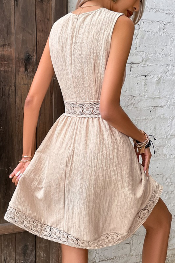This mini dress features - Eyelet fabric - V neckline - Nonfunctional buttons on bodice - Sleeveless - Lace on waistline and hem - Fit and flare design - Mini dress - Zipper back closure - Runs true to size
