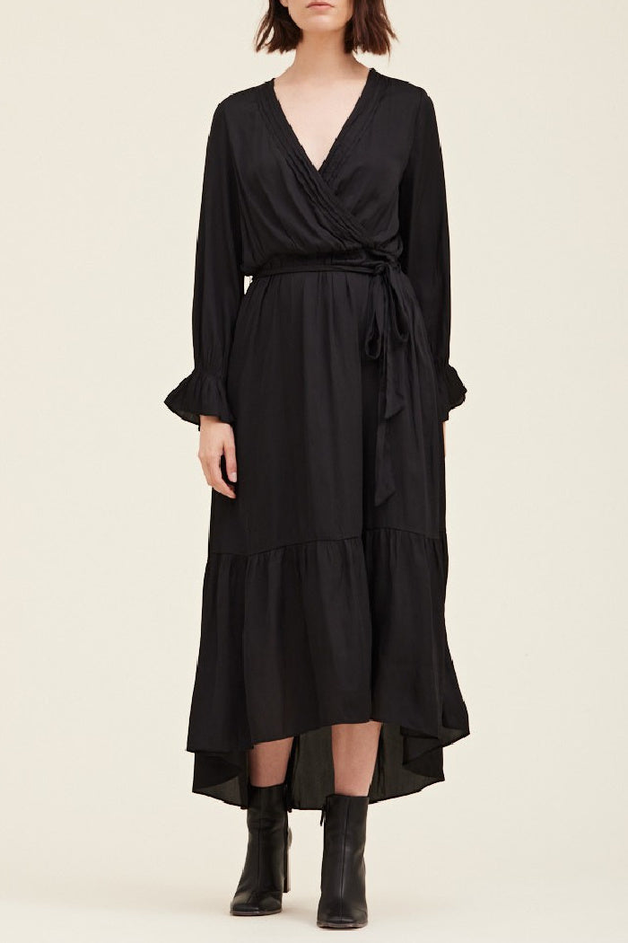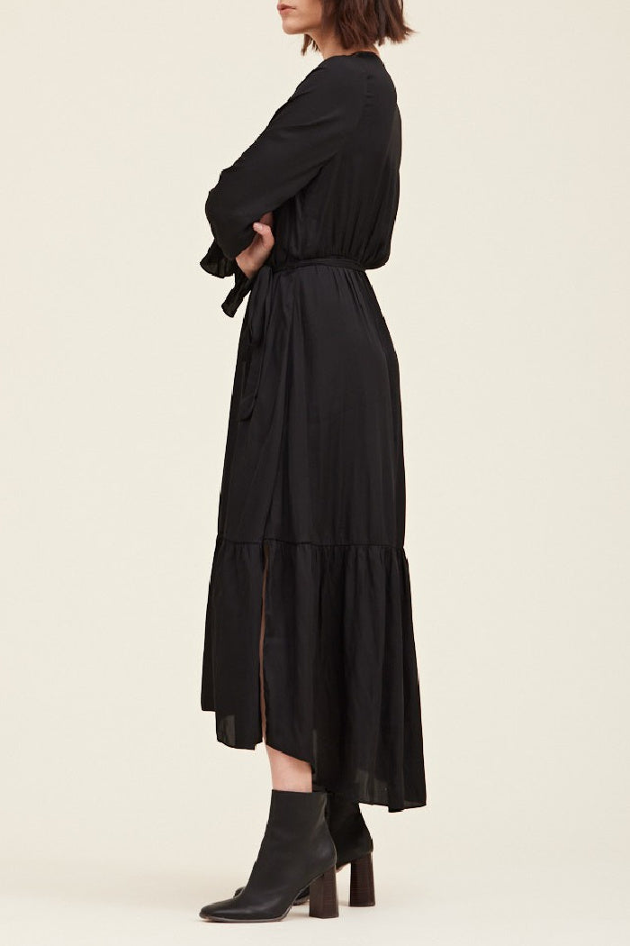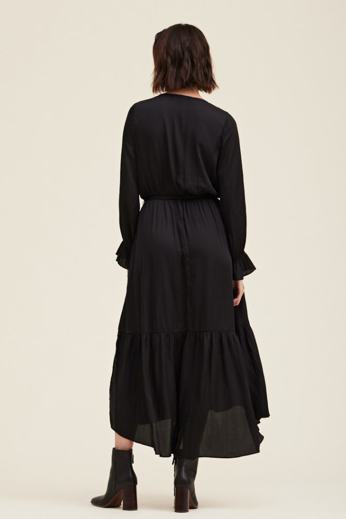 Beautiful solid satin dress with v-neckline, elastic waist, tiered skirt with hi/lo hem and ruffle cuff long sleeve. Tie belt and side slit. Model is wearing a size small. Refer to measurements for your perfect fit. Across chest measurements; Small 16”, Medium 17”, Large 18". Shoulder to Front Hem; Small 47”, Medium 47.5”, Large 48".