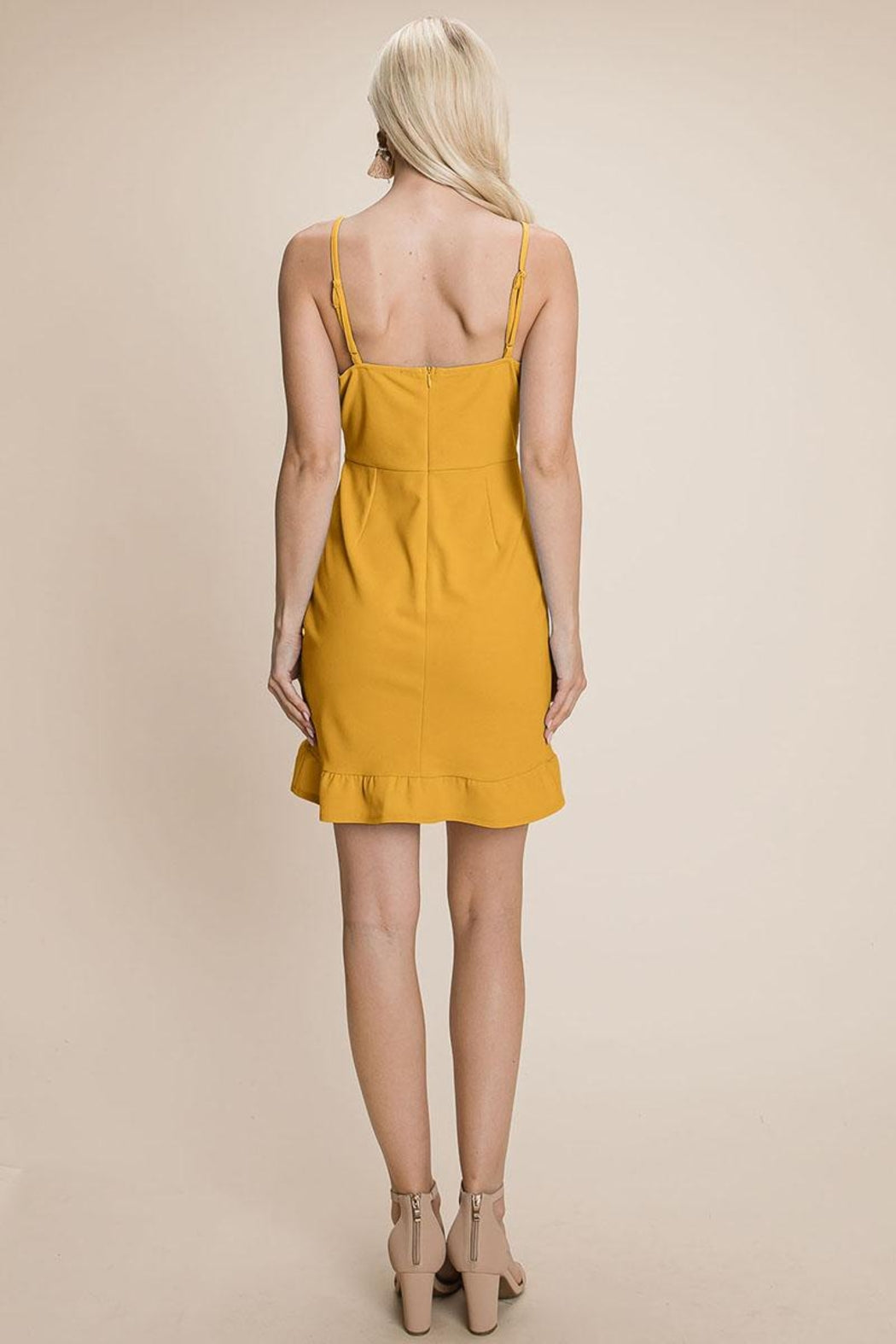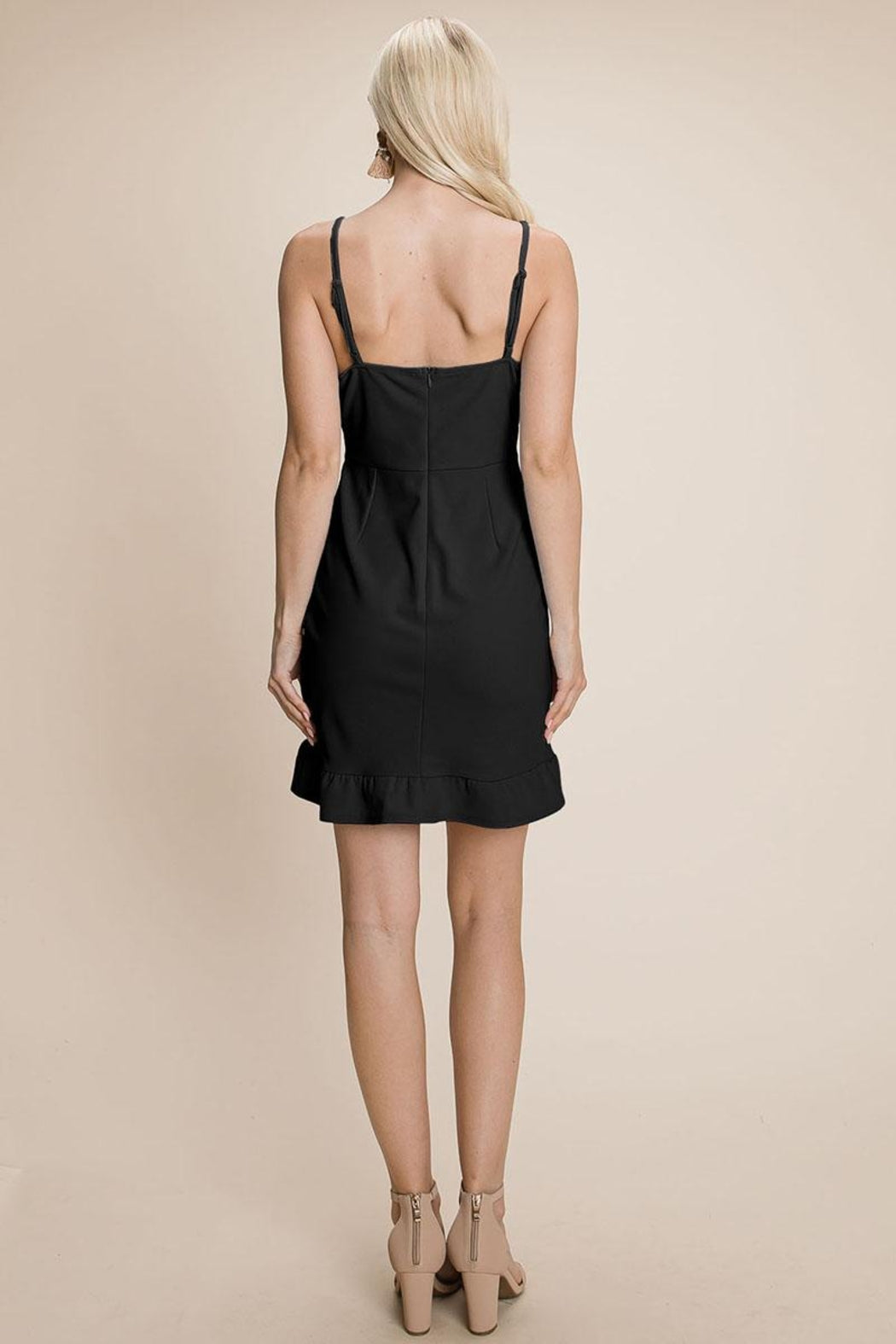 Features: Sleeveless, Hidden Back Zipper, Adjustable Strap, Mini, Asymmetrical Ruffle Hem, Wrap Dress, Mini Length