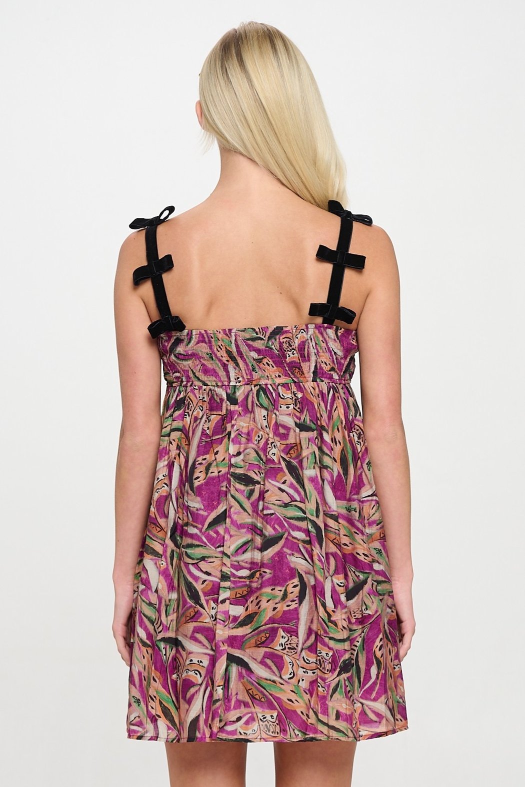 Step into summer with this playful tropical print mini dress, featuring charming velvet bow straps for a touch of elegance. The vibrant print showcases a mix of earthy tones and bright purples, creating a fun and lively look. The relaxed, flowy silhouette makes it perfect for warm-weather outings, while the smocked bodice ensures a comfortable and flattering fit. Pair it with sandals for a casual day out or dress it up with heels for a chic evening look.