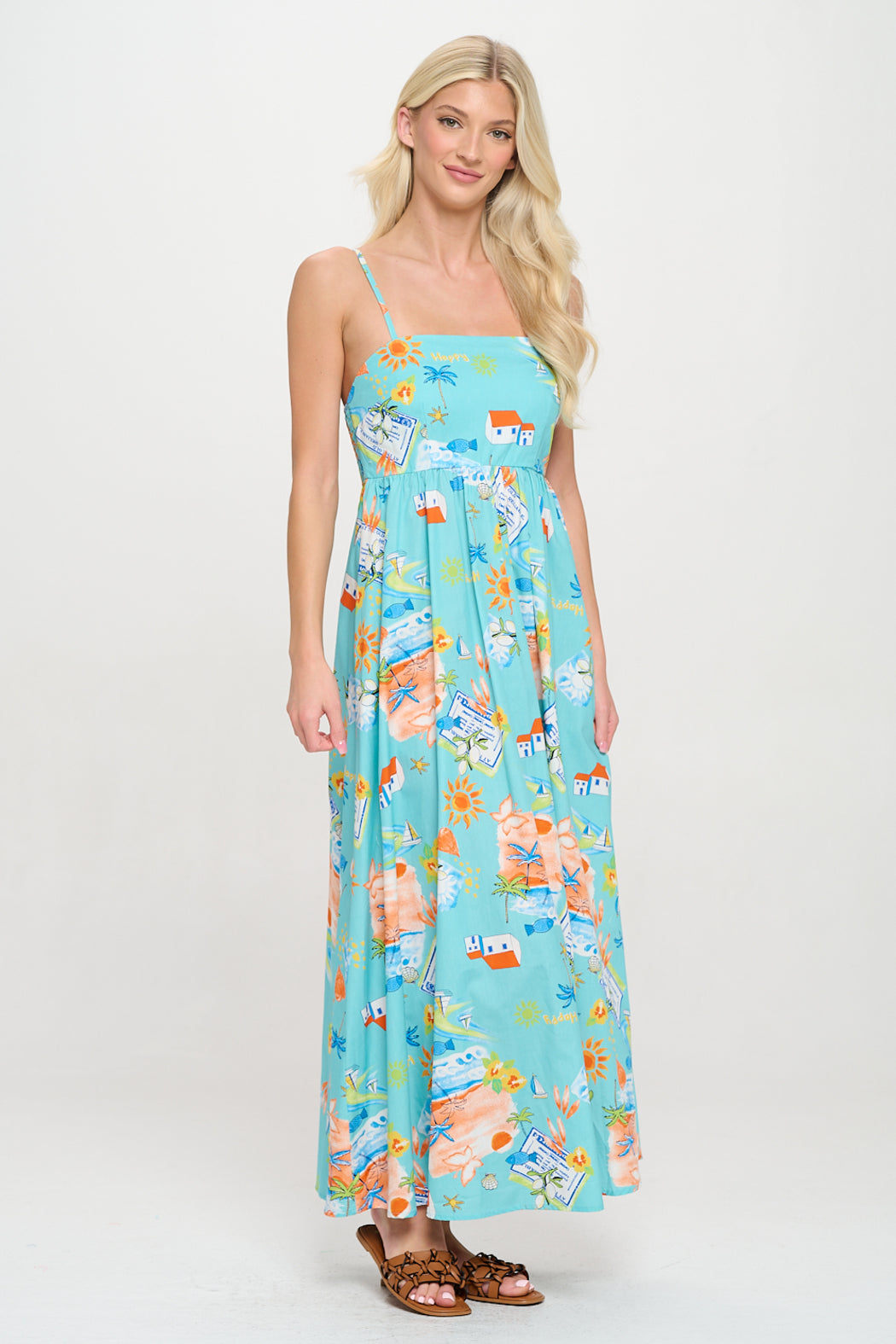 Step into your next sun-soaked getaway with the Azure Escape Maxi Dress. A breezy showstopper inspired by coastal charm. Featuring a square neckline and adjustable spaghetti straps, this dress offers a flattering empire waist and flowy tiered silhouette that moves effortlessly with you. The vibrant scenic print adds a touch of wanderlust, perfect for strolling beach boardwalks or sipping cocktails at sunset. Designed with lightweight cotton for all-day comfort, this maxi is the epitome of vacation ease—just add sandals and a woven bag for an unforgettable look.