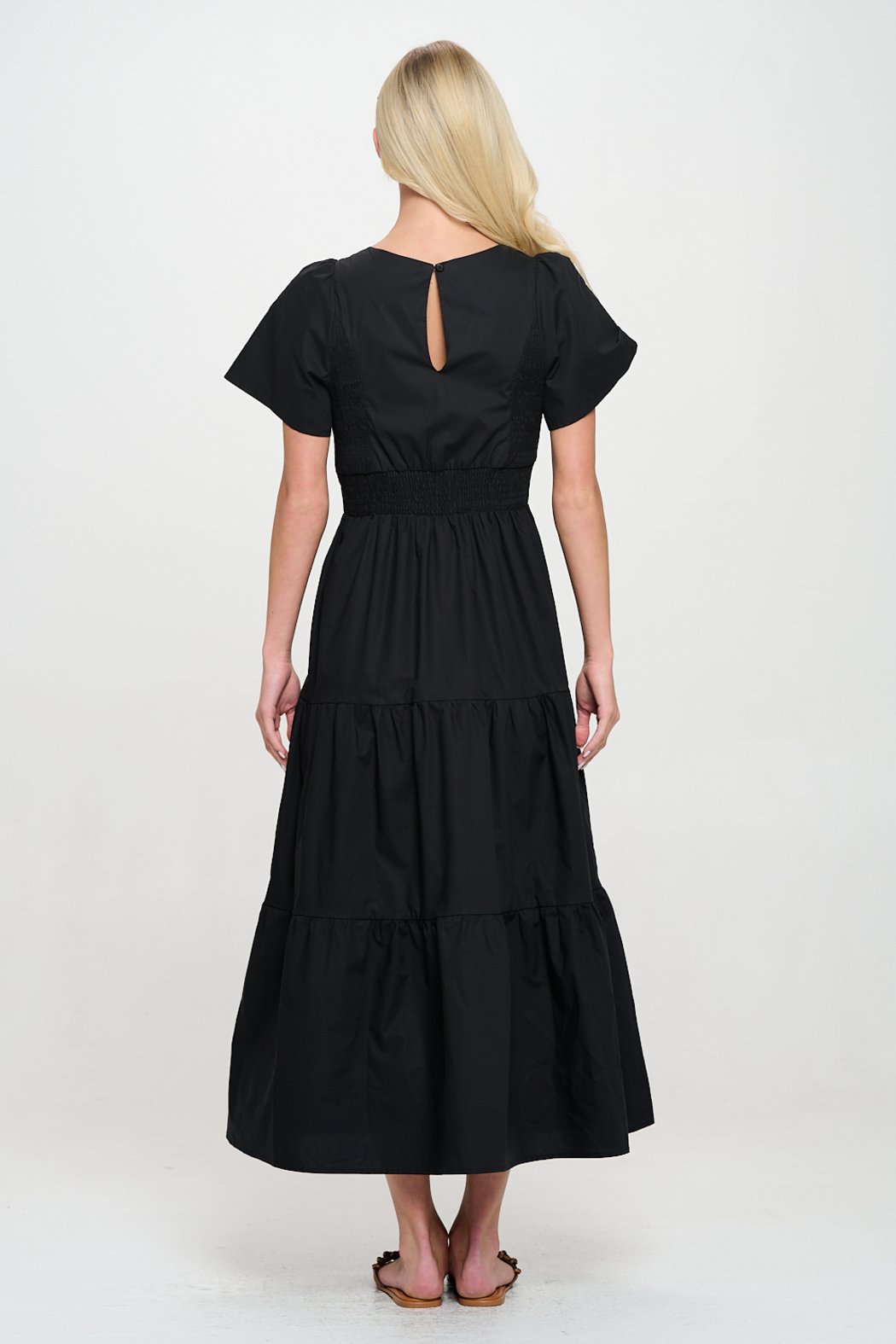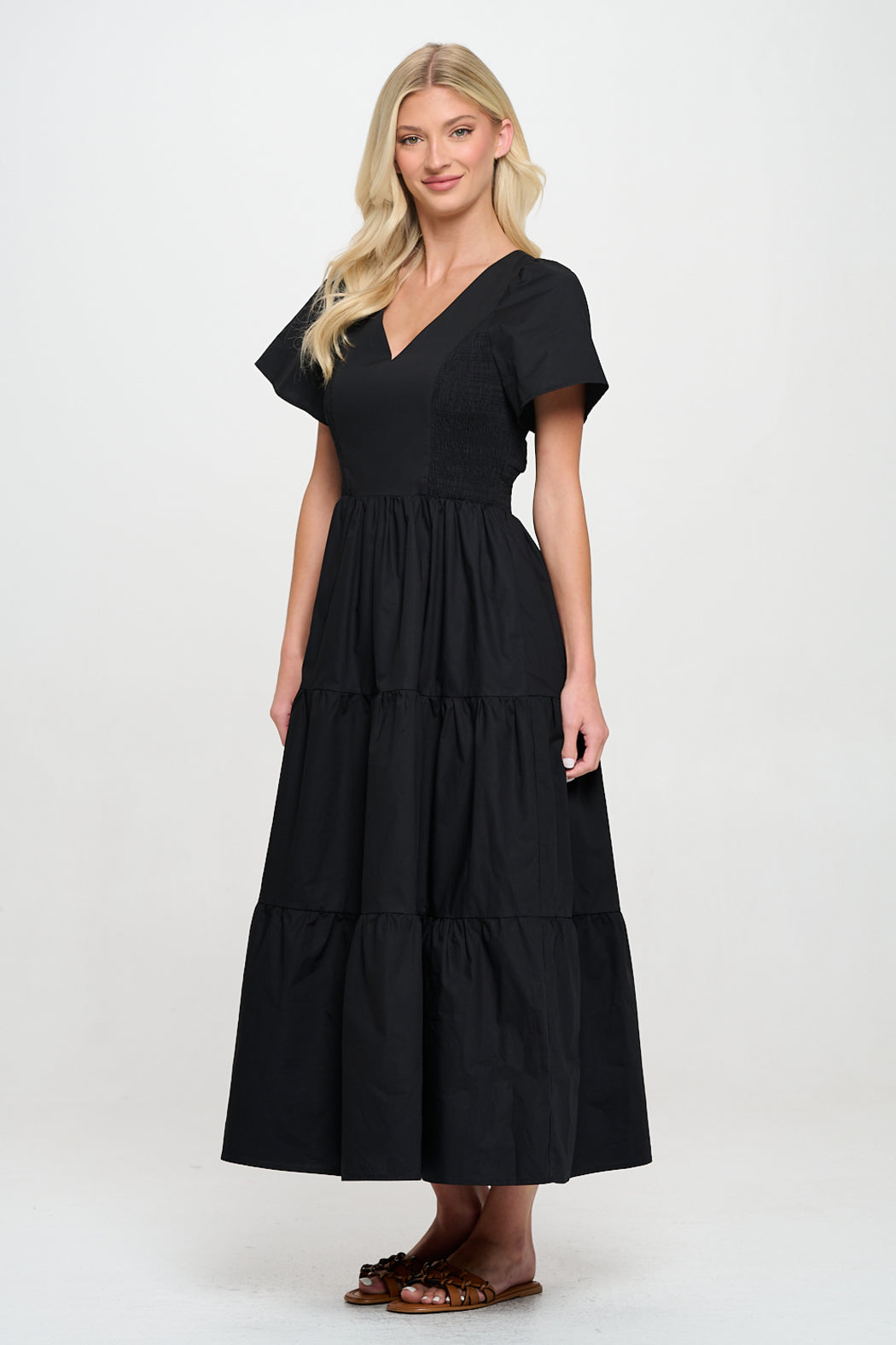 Discover timeless elegance with this black tiered maxi dress. Designed with a flattering V-neckline and flutter sleeves, this dress is perfect for any occasion, from casual outings to more formal events. The tiered skirt adds a touch of volume and movement, while the smocked detailing on the sides ensures a comfortable and tailored fit. Made from lightweight, breathable fabric, this dress is both stylish and versatile. Pair it with sandals for a relaxed look or dress it up with heels and accessories for a night out.