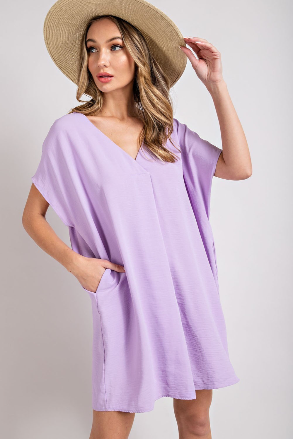 Short sleeve v-neck dress perfect for an everyday, casual look. Super comfortable material and the dress features pockets!