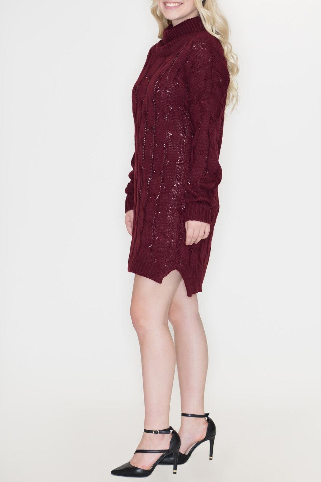 Burgundy chunky cable knit sweater dress with cowl neck and high low hem with side slits.