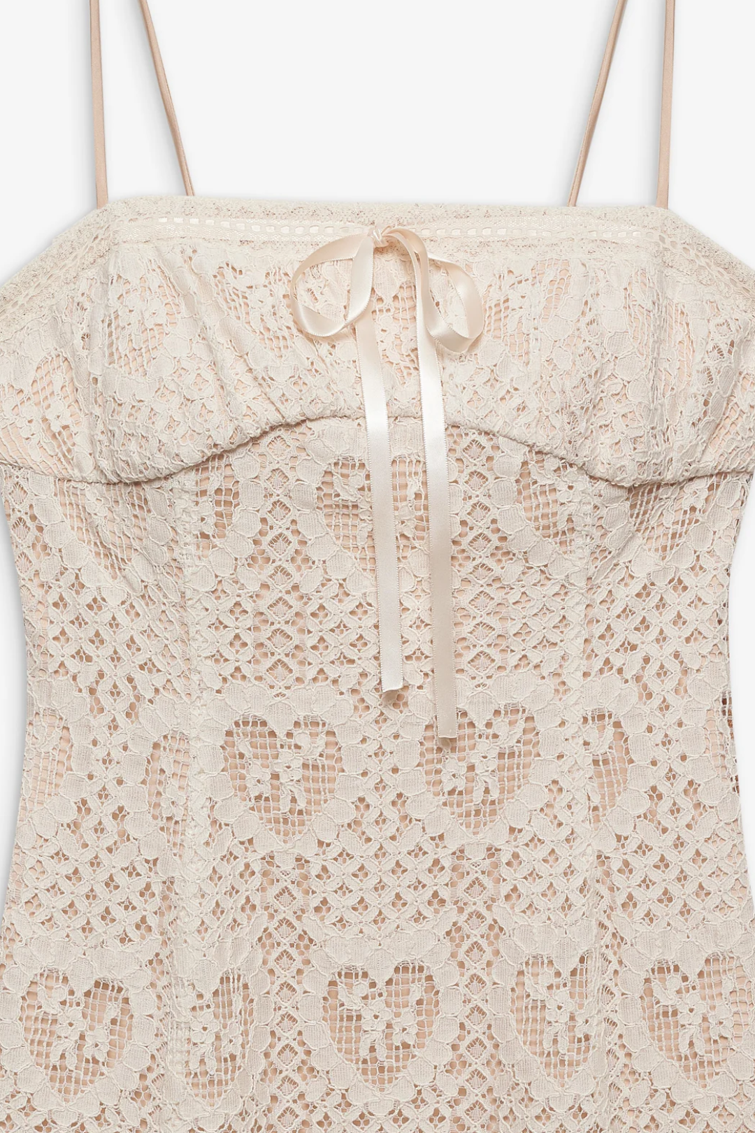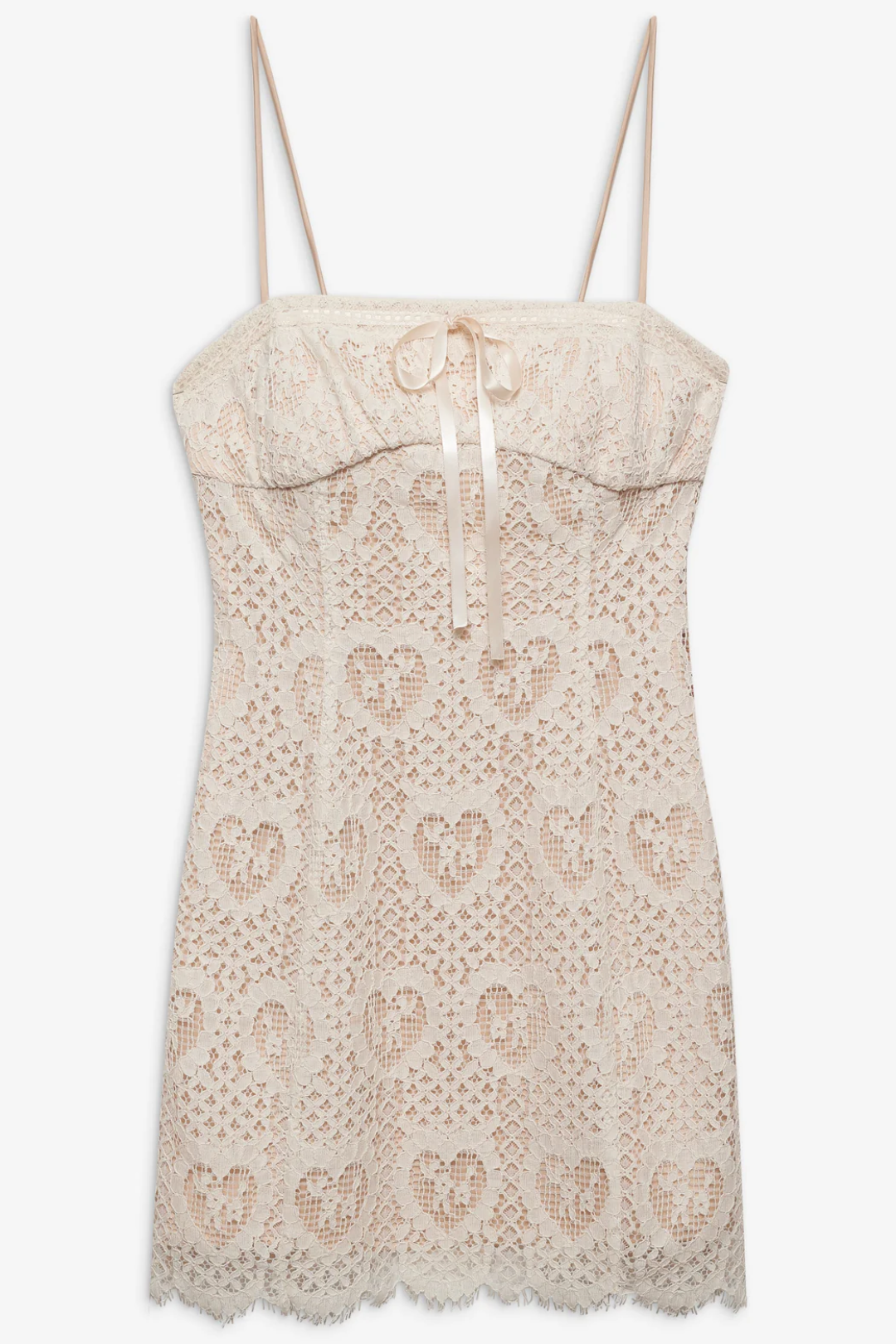 Make your date's heart skip a beat in this enchanting Claire Lace Heart Mini Dress. It's a lace dress with an allover crochet lace print, a slotted lace trim, a ribbon along the neckline, and an embroidered scallop hem. Perfect for a romantic evening, bridal shower, wedding after party, or any celebration! Features: - Straight neckline - Functional tie at the center front - Invisible zipper at the left waist - Fully lined - Cream color Accessorize it with a hair ribbon, delicate jewelry, a cute handbag, and a pair of high heels for a stunning, show-stopping ensemble. Fabric: 40% Cotton, 32% Organic cotton, 28% Polyester | Lining: 100% Polyester Model is wearing a size Small.