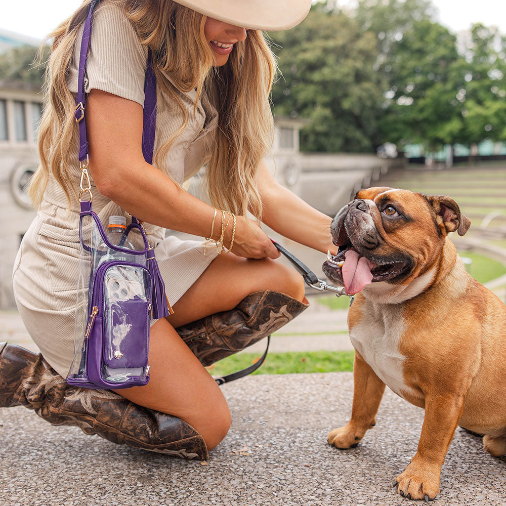 This Clear HydroBag® Stadium with Purple Trim and Matching Pouch is a stylish accessory for any fan who wants to be "game day ready"! It's the perfect crossbody bag to carry your water bottle, keys, cards, and cash hands-free, you won't even break a sweat! Score the winning look and show your team spirit!