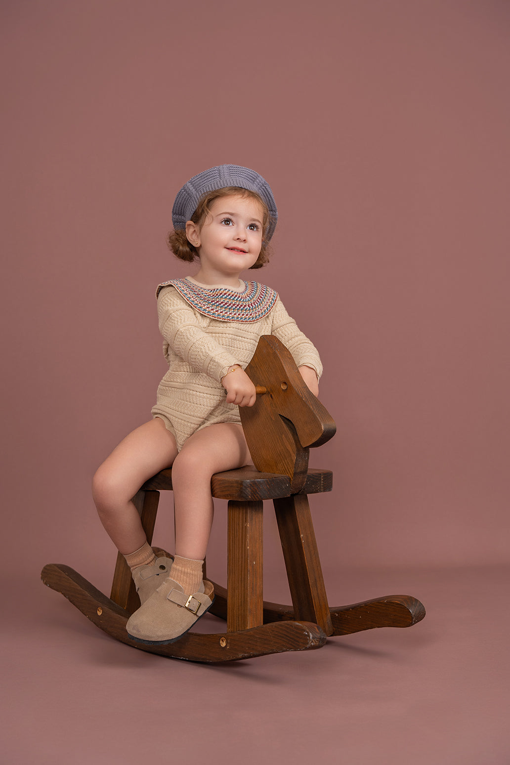Baby girls knit bubble with multicollar crotched neck, center back button opening,scalloped edge cuffs and leg opening with button closure at bottom. ֲ