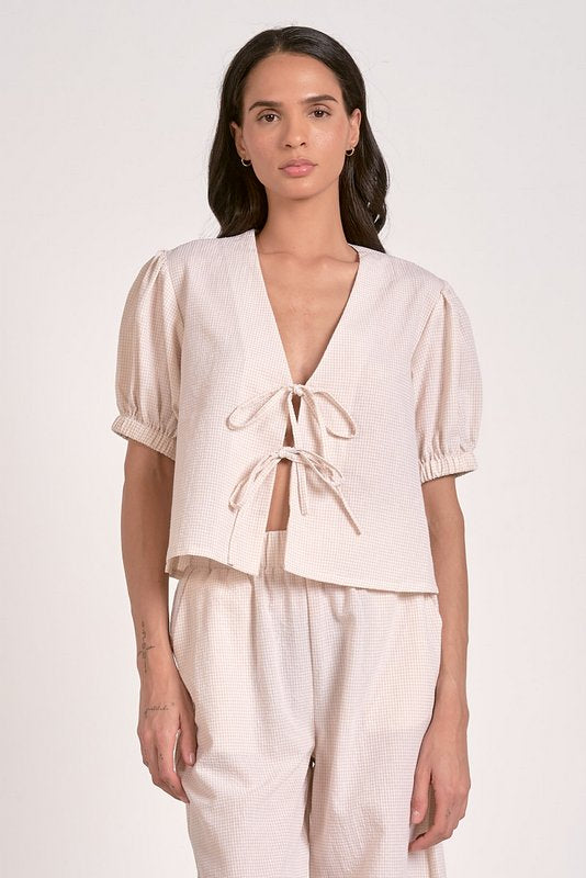 The Dolce Fly Away Top features puffed short sleeves for a feminine touch and a relaxed, flowy fit. Designed with a tie-front detail and crafted in an airy pincheck pattern fabric, it’s the perfect blend of sweet and effortless.