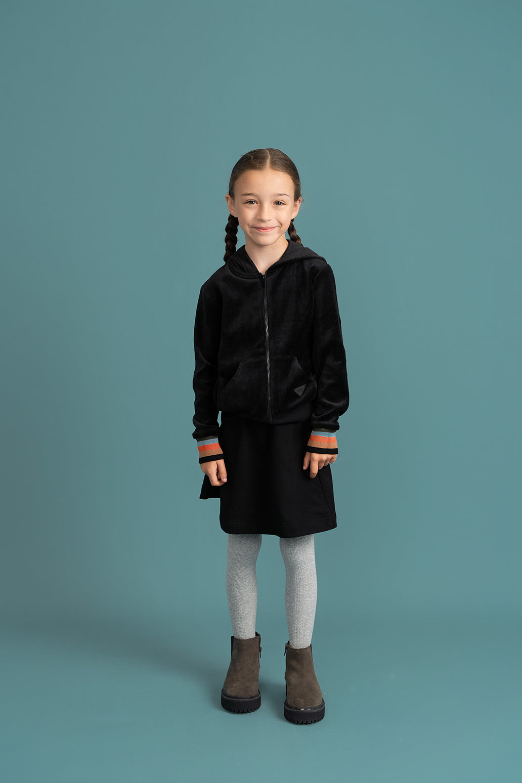 Girls soft french fleece flare skirt with covered elastic waistband and twill tape insert at center front.ֲ